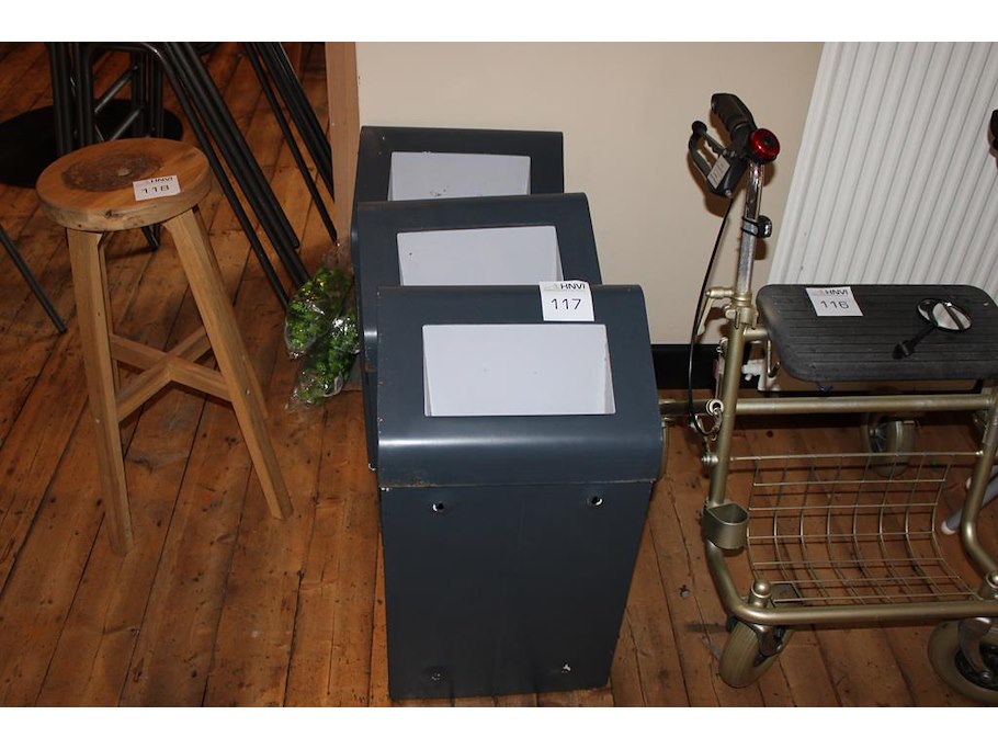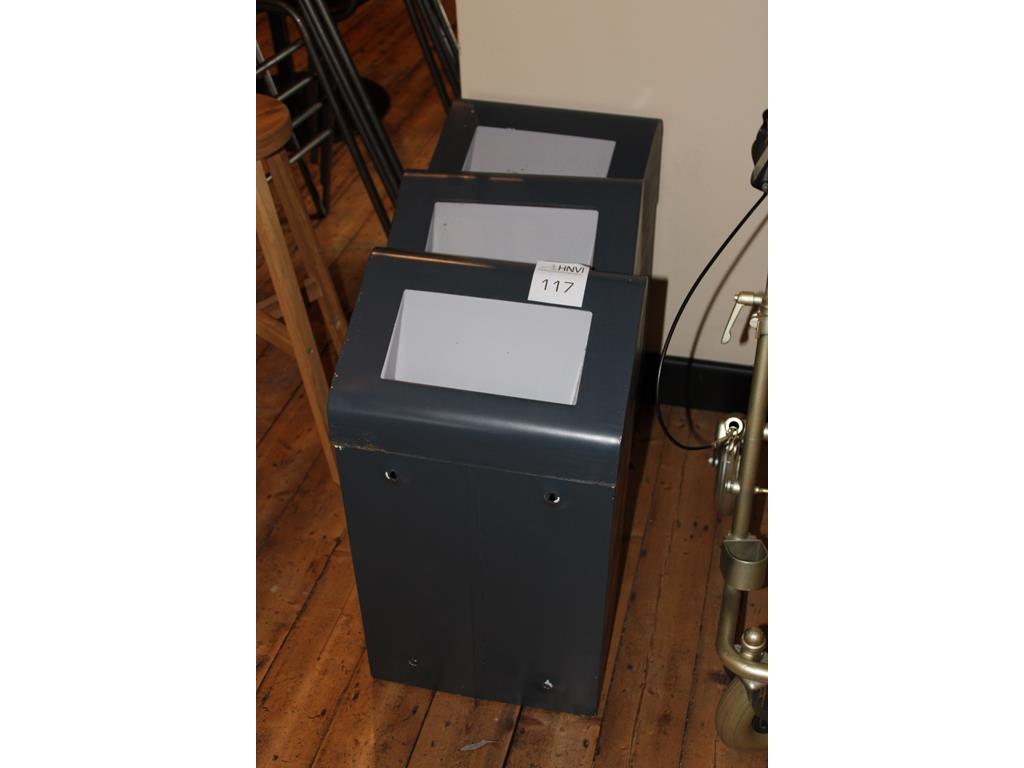 Drie metalen prullenbakken met klepdeksel. Afmeting 37 x 25 x 68 cm.