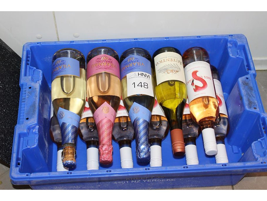 Diverse wijnen in krat w.o. rose, wit en 0.0. 11 flessen.