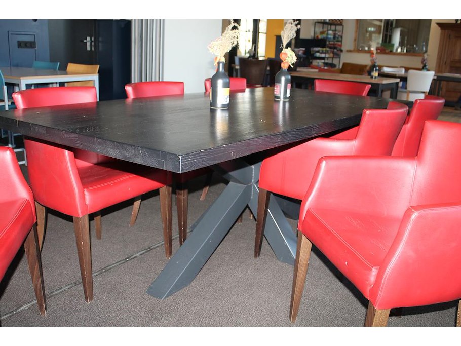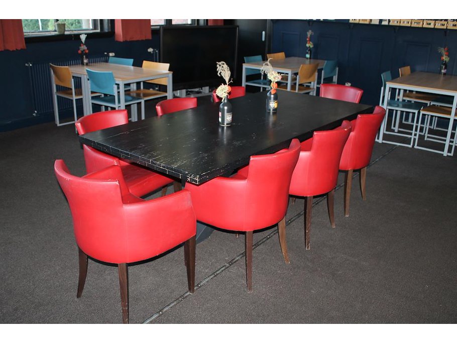Stamtafel met 8 rood gestoffeerde fauteuils. afmeting tafel 220 x 100 x 76 cm.