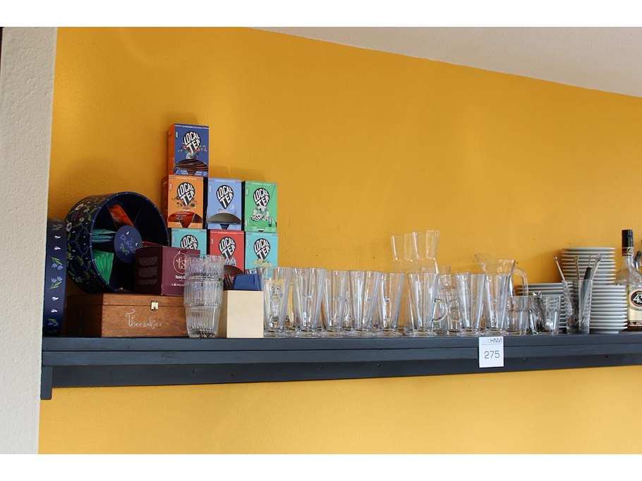 Theeproducten waaronder glazen, onderzetters en thee op schap.