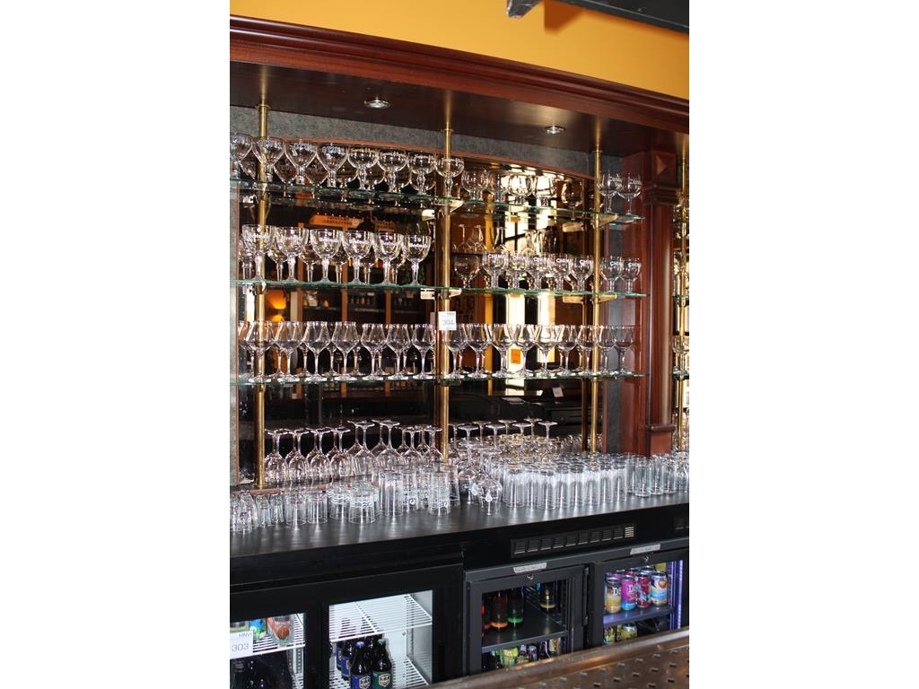 Grote hoeveelheid glaswerk voornamelijk bierglazen, voor en op achterwand, ruim 200 glazen.