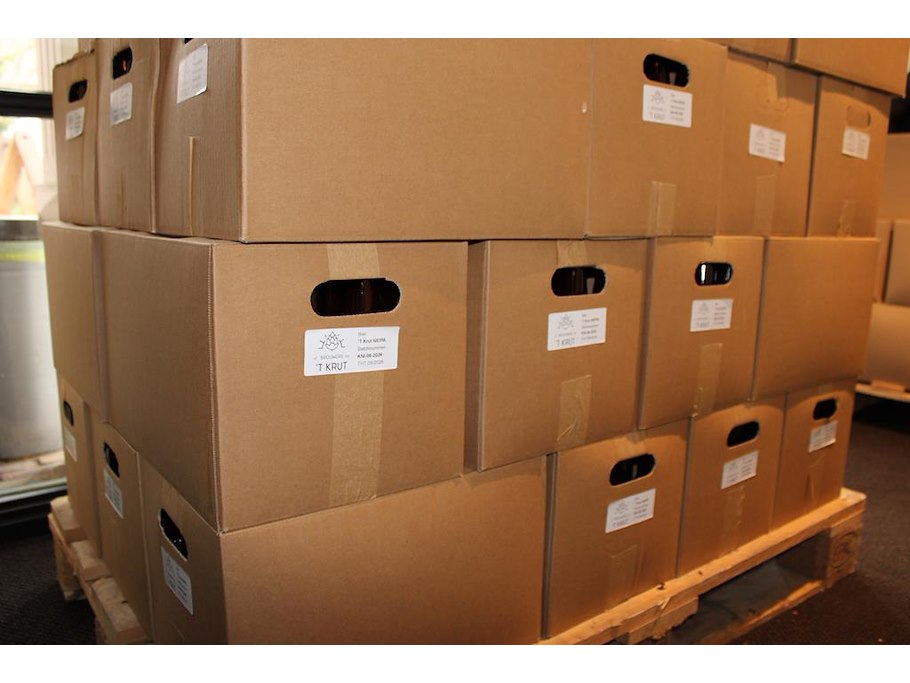 Negen dozen NEIPA 'T KRUT THT 08-2026. Totaal 216 flesjes.