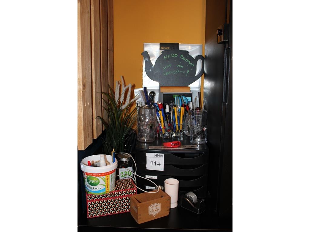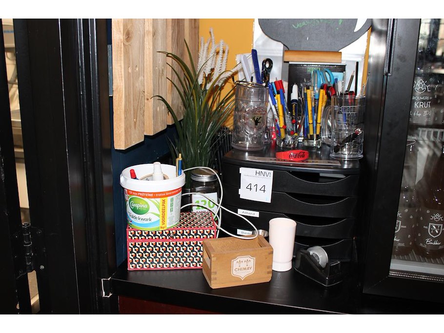 Kantoormaterialen waaronder brievenbakjes, schrijfgerei en tapedispenser.