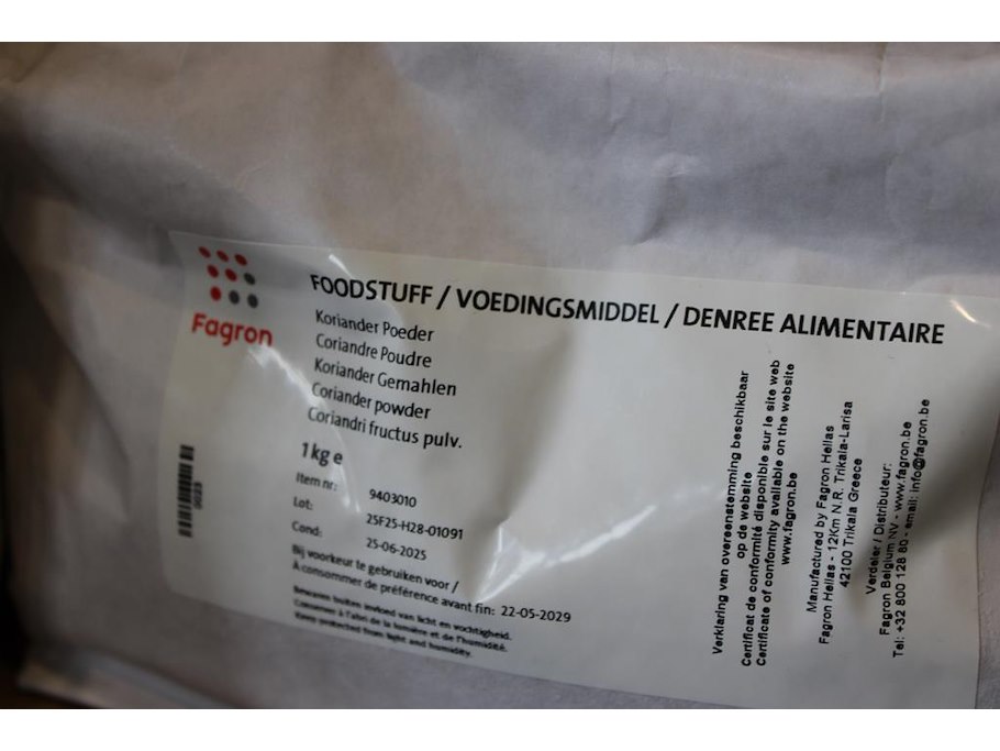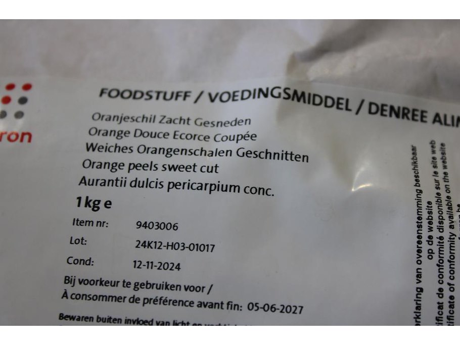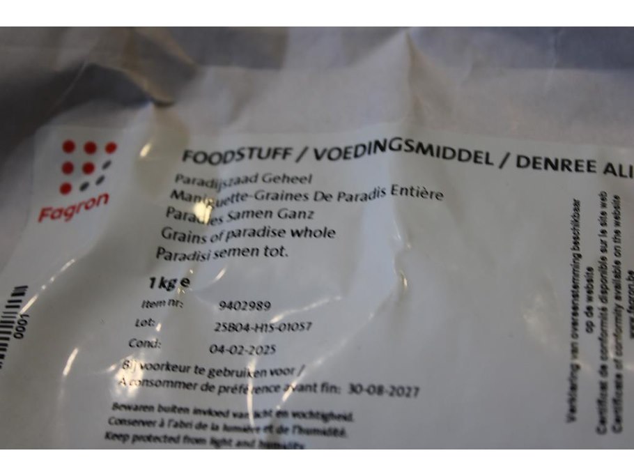 Diverse grondstoffen op schap waaronder paradijszaad, korianderpoeder en oranje schil.