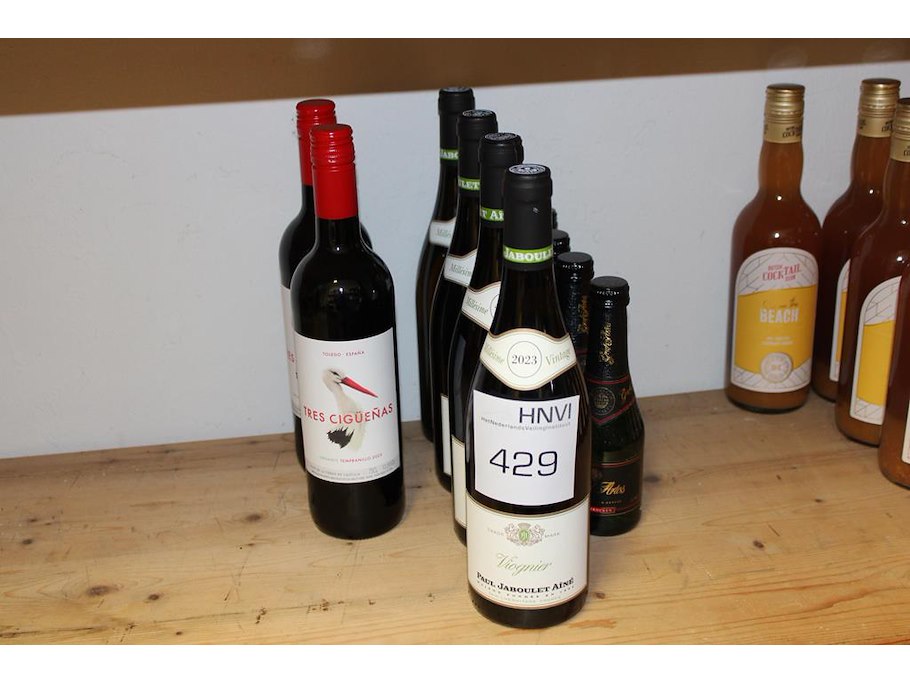 Zes flessen witte en rode wijn op schap.