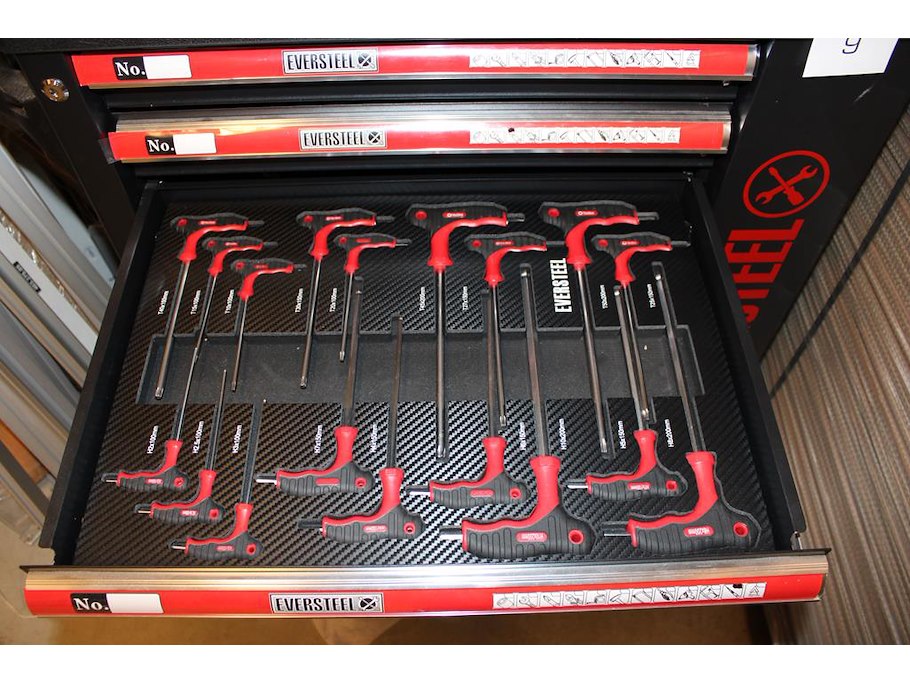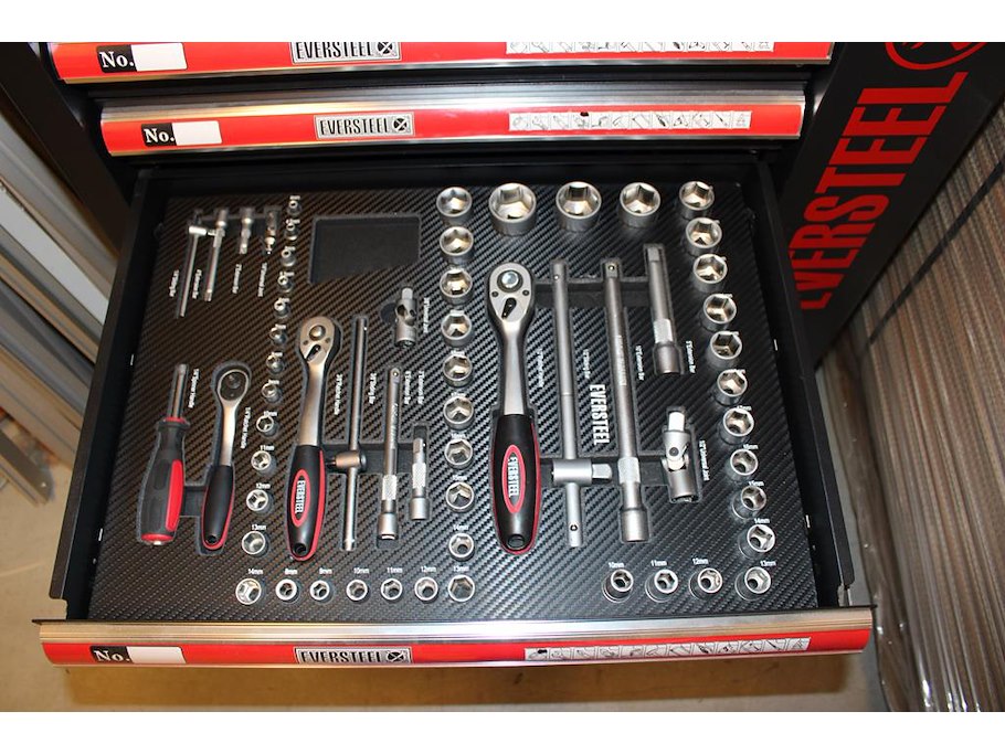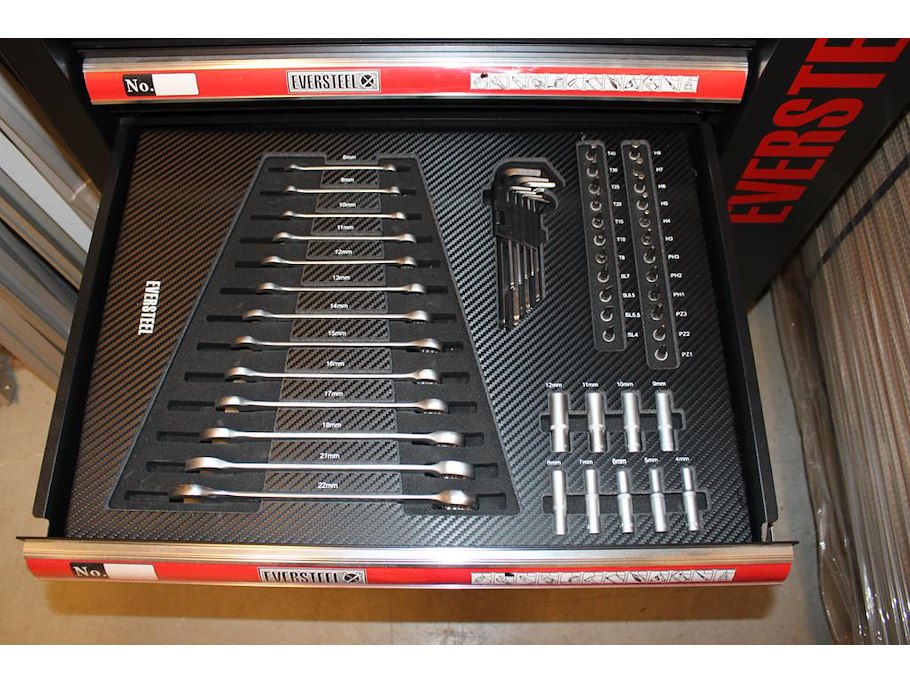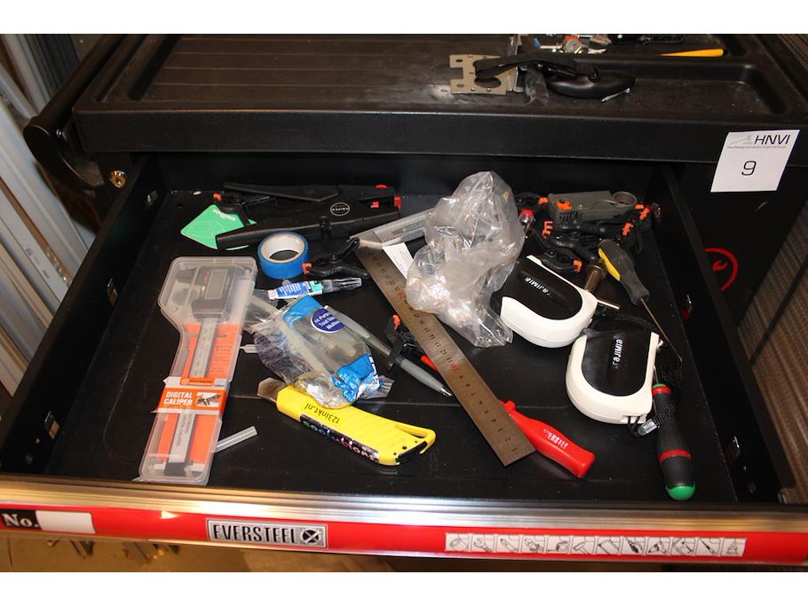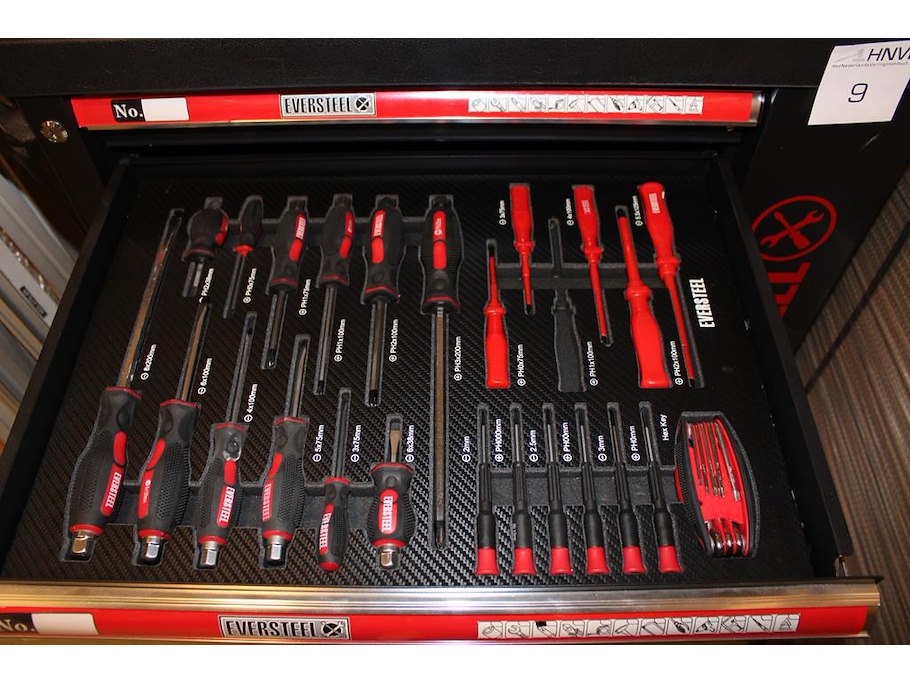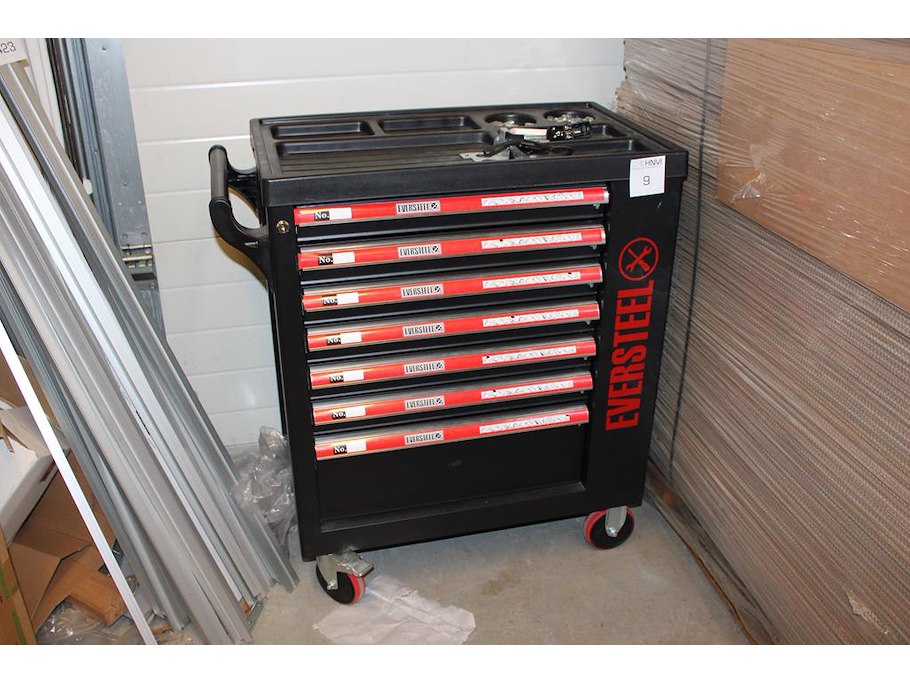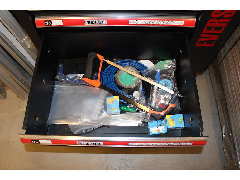 Gereedschapswagen EVERSTEEL gevuld met diverse gereedschap w.o. schroevendraaiers, doppenset, tangen, sleutels, etc.