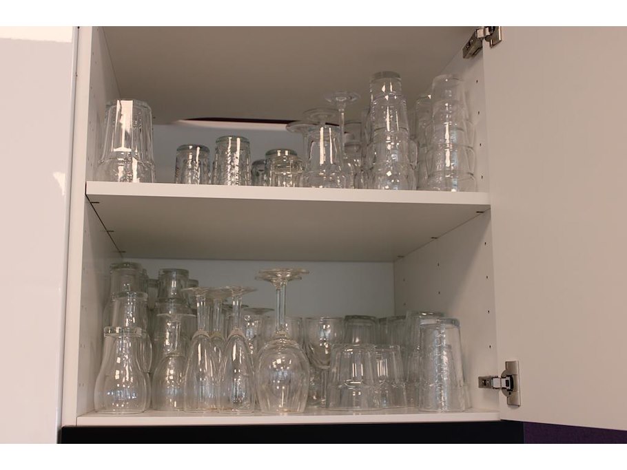 Glaswerk in kast w.o. wijn, fris en waterglazen.