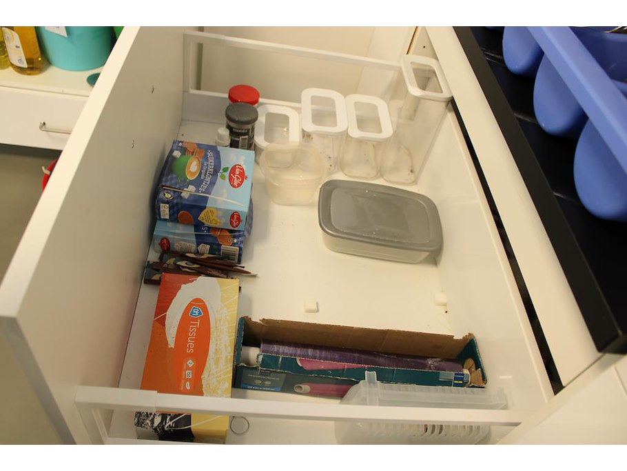 Kunststof bakjes en disposables in 2 laden.
