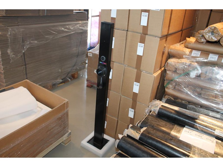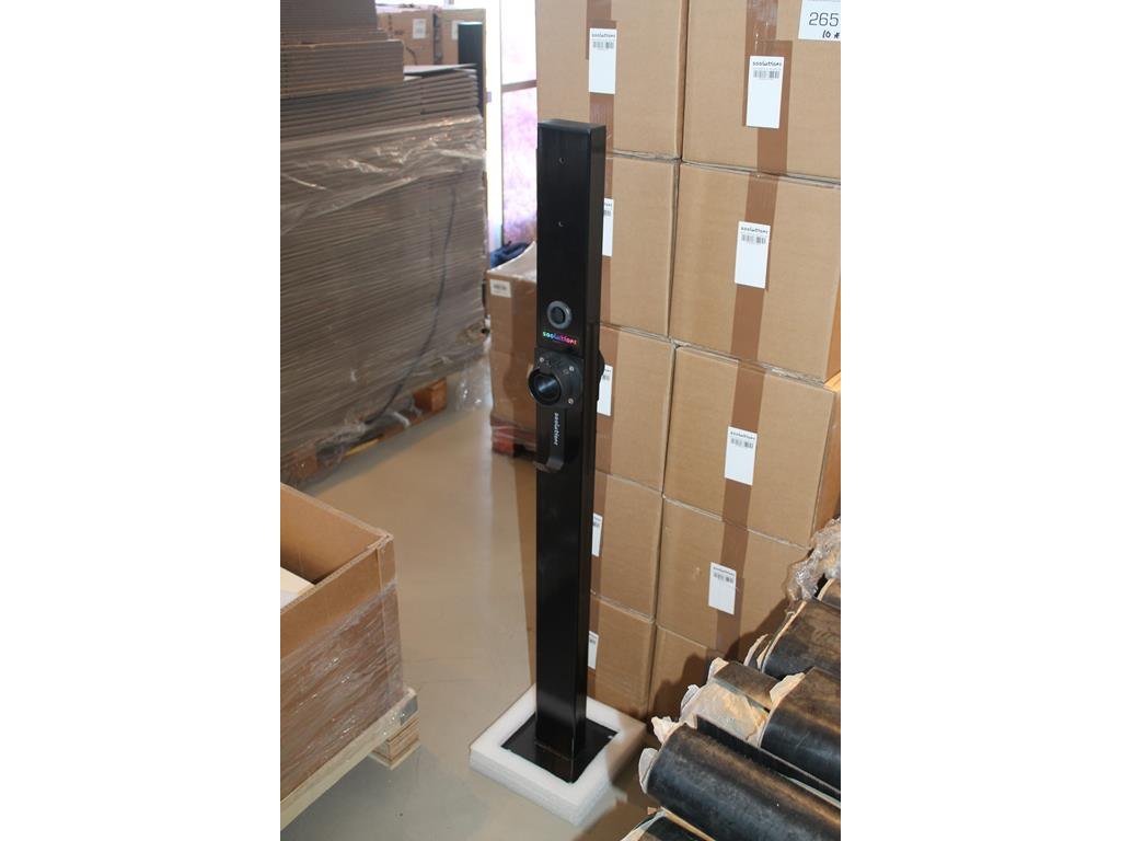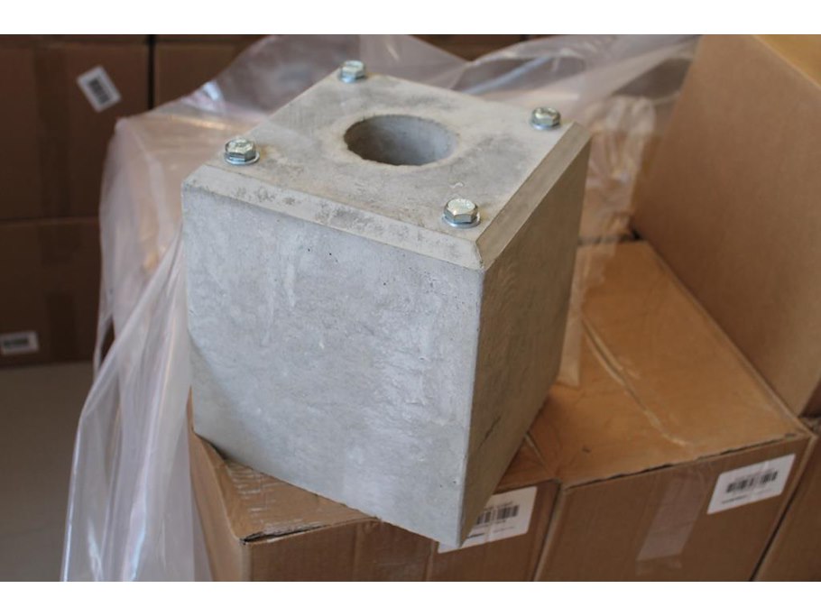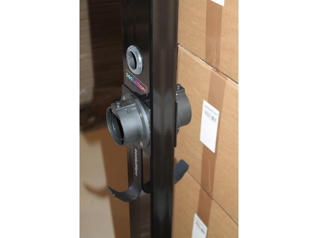Dubbelzijdige laadpaal met betonnen voet, hoogte 130 cm, 2 kabelhaken en houders voor stekker.