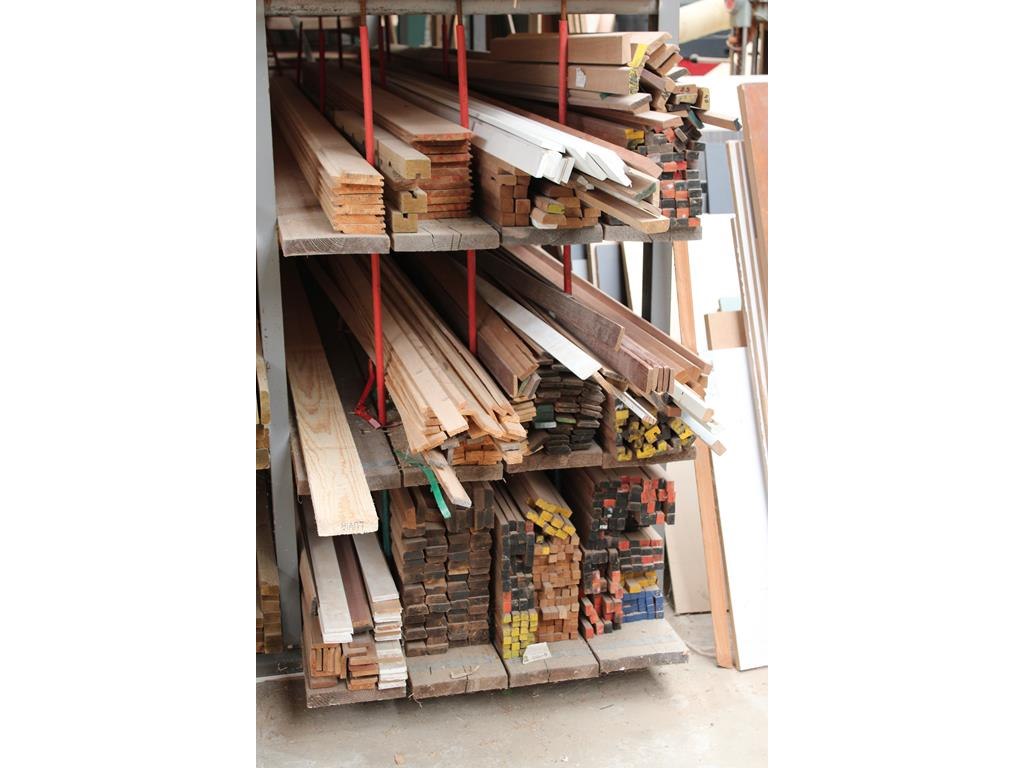 Houten planken, balken en latten in 5 vakken van en op stelling.