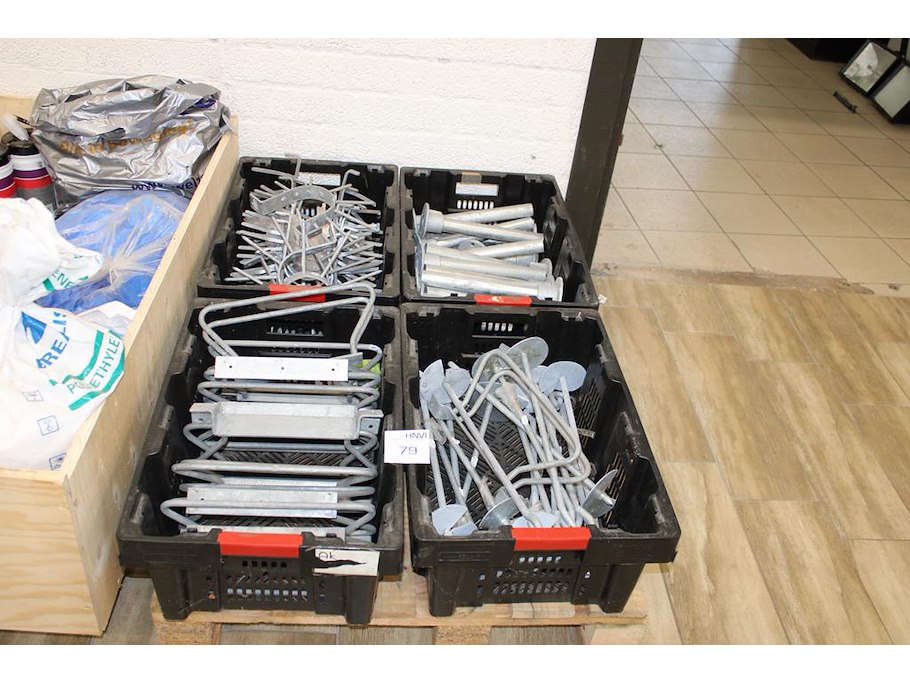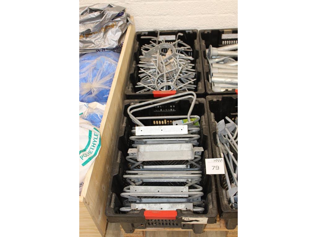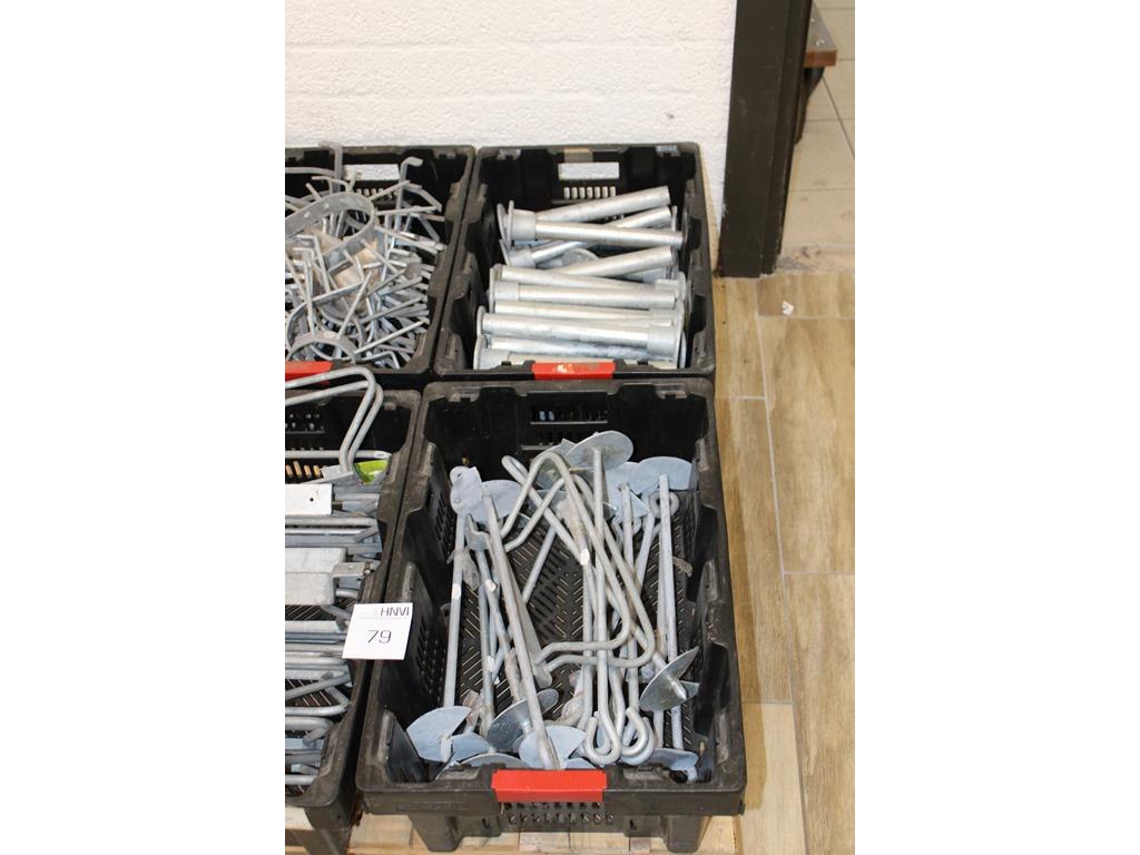 Gegalvaniseerde producten op pallet w.o. fietsensteunen, grondpinnen en klimbeveiliging.