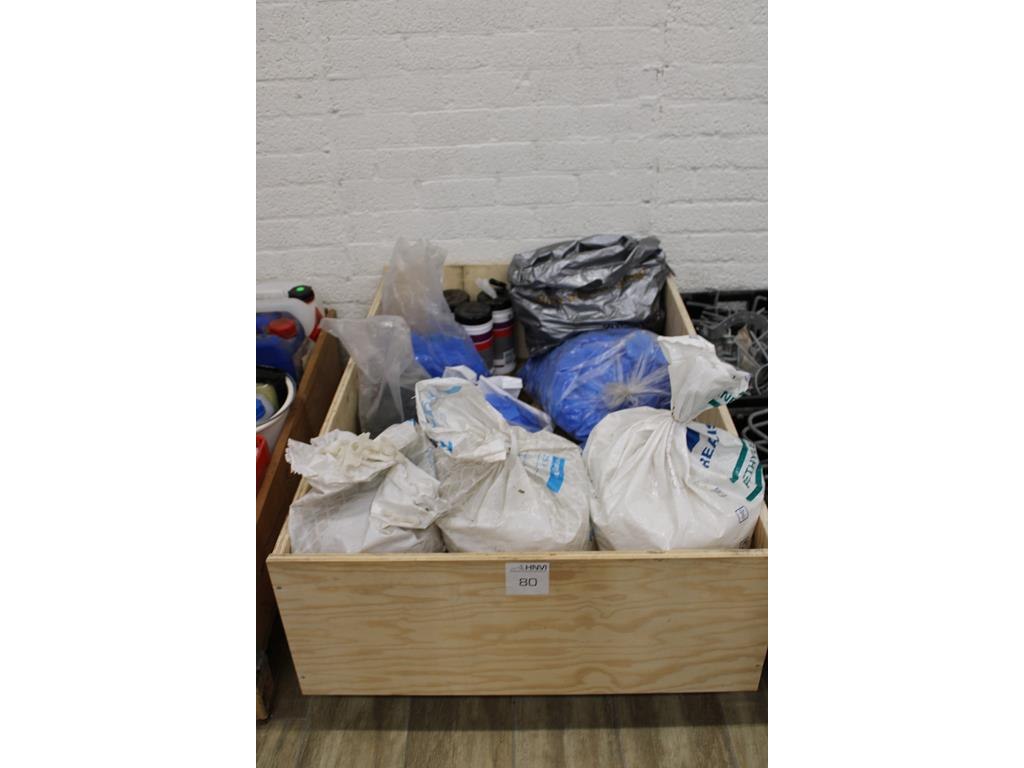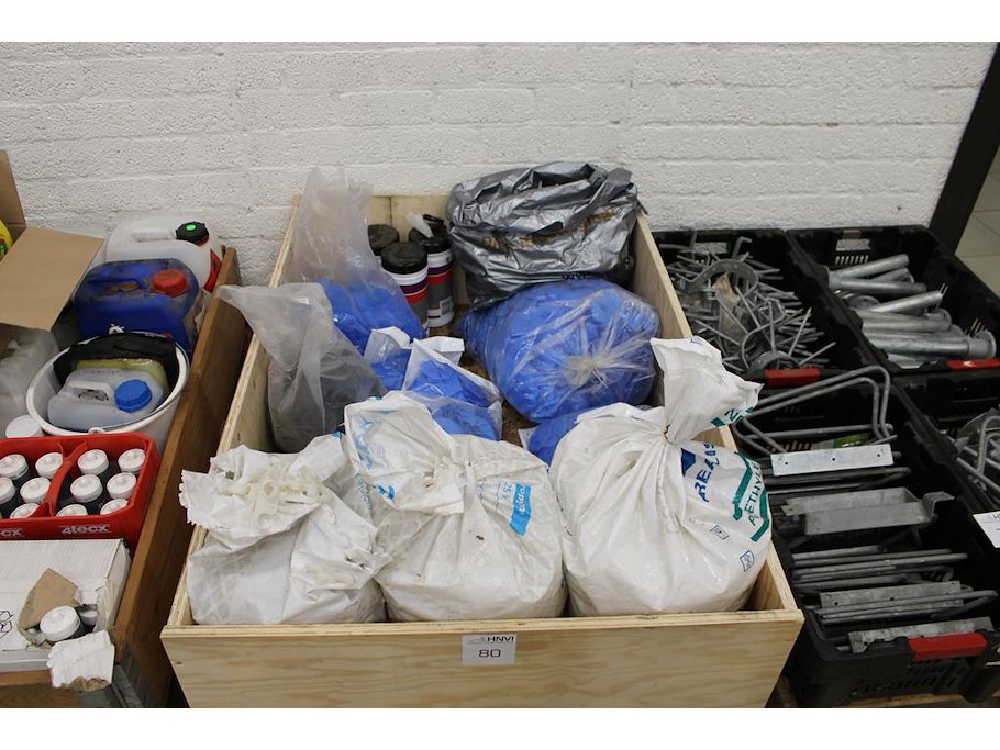 Installatiematerialen op pallet w.o. buizenklemmen, rozetten en poetsdoeken.