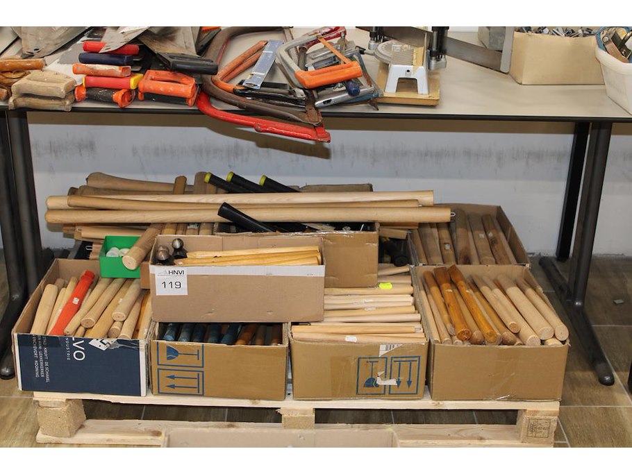 Houten stelen in grote diversiteit en hamers op pallet.