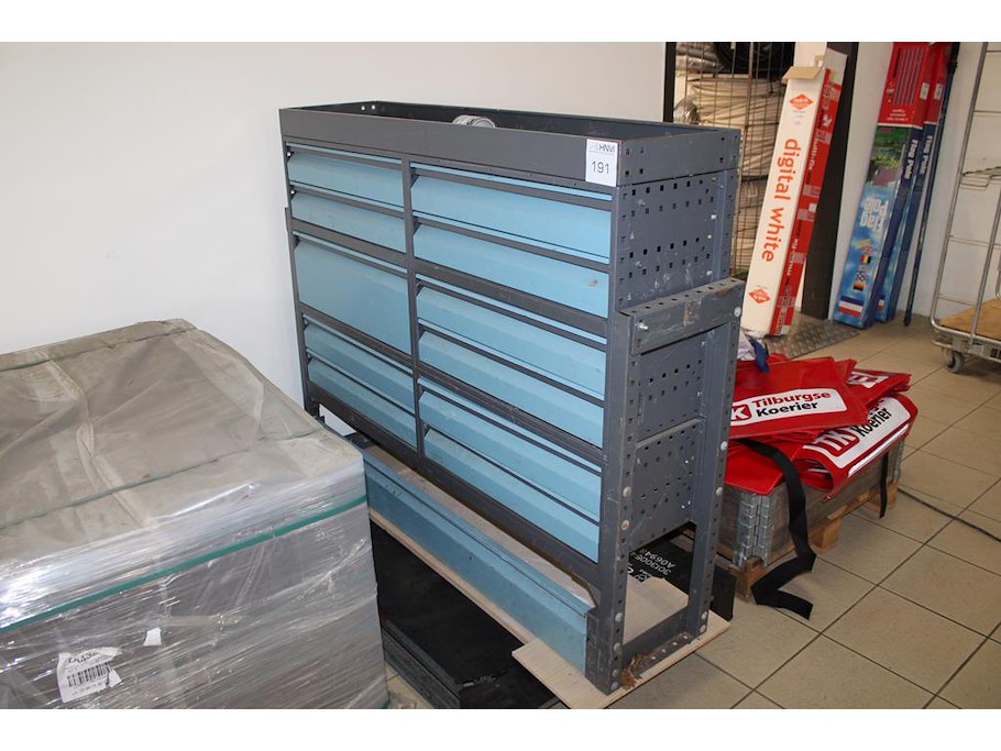 Bedrijfsbus inrichting met 9 laden en klep. afmeting 137 x 32 x 112 cm.