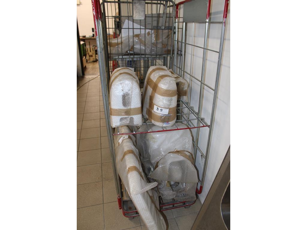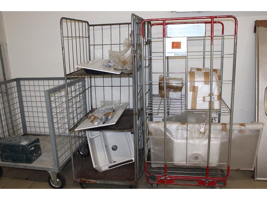 Drie wasbakken, toilet en gootsteen in 2 rolcontainers.