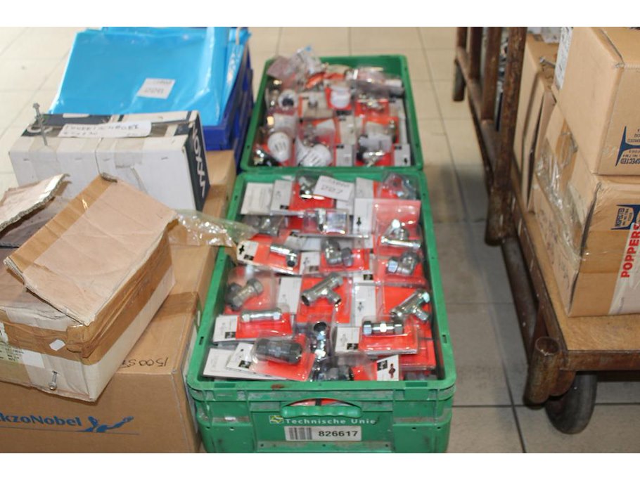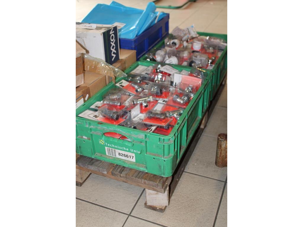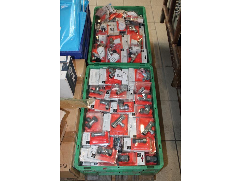 Verwarmingskoppelingen, kranen en thermostaatkranen in twee kunststof kratten.