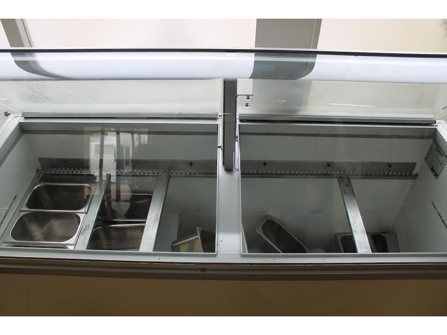 Vitrinevriezer ijssalon HUSSMANN DCC012208 met 16 gastronorm bakken. Afmeting 172 x 66 x 125 cm.