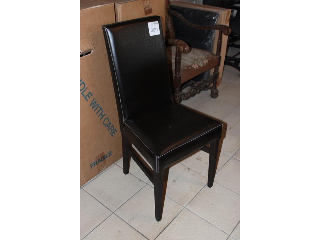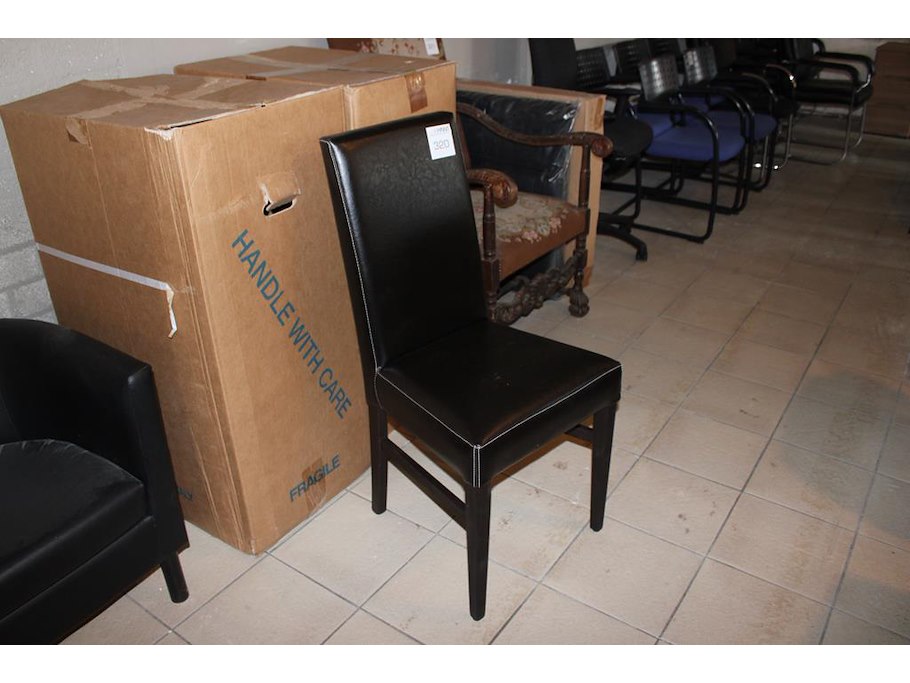 Vier eetkamer stoelen met kunstlederen zitting en houten onderstel.