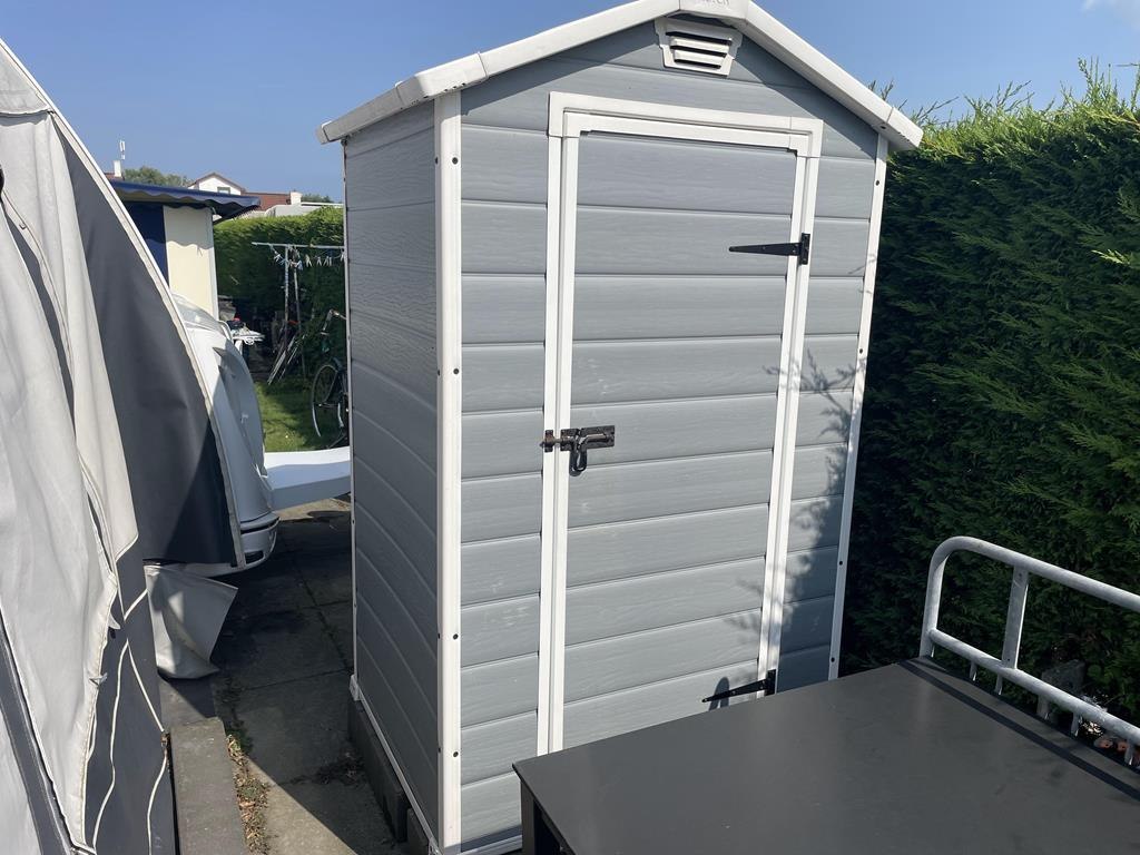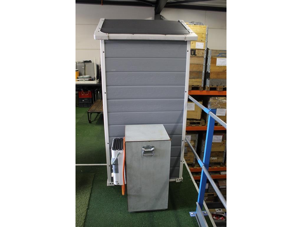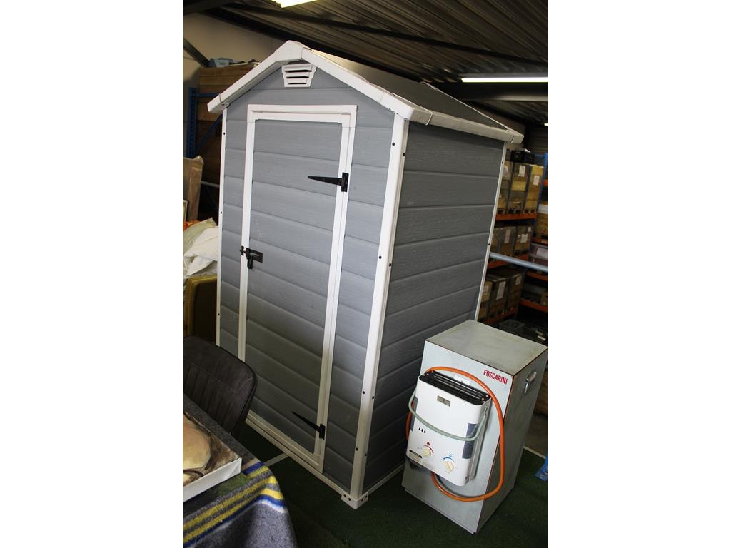 Buitendouche met warmwatergeiser ECCOTEMP en kunststoffen douchehuisje KETER met ingebouwde afvoer. Geiser voor propaangas en Gardena aansluiting. Geiser is hier opgebouwd op houten blok met handgrepen, maar kan overal op gemonteerd worden. Afmeting huisje 127,5 x 102 cm. Hoogte 196 cm. Stenen onderlaag ( laatste foto) is als voorbeeld hoe afvoerslang evt. weggewerkt kan worden, deze stenen worden niet meegeleverd.