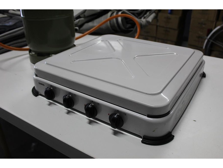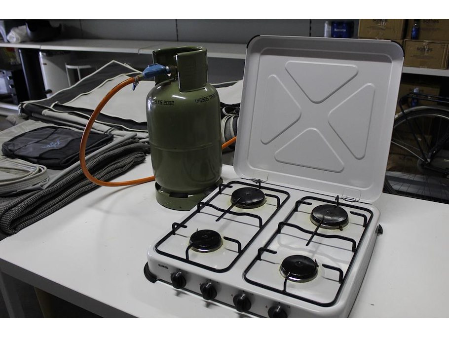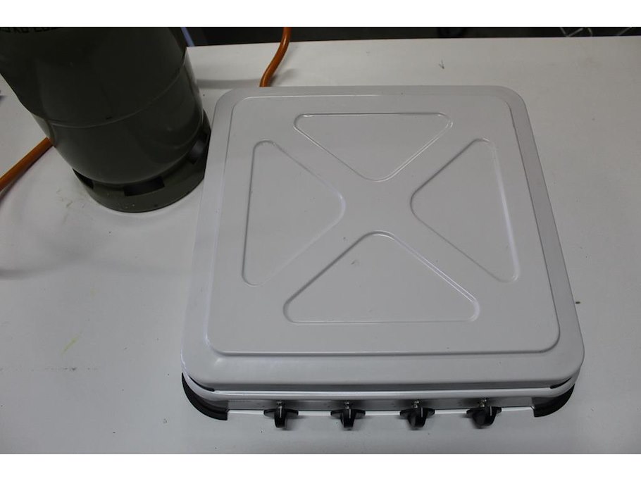 Vierpits kooktoestel met gasfles. Afmeting 50 x 50 cm.