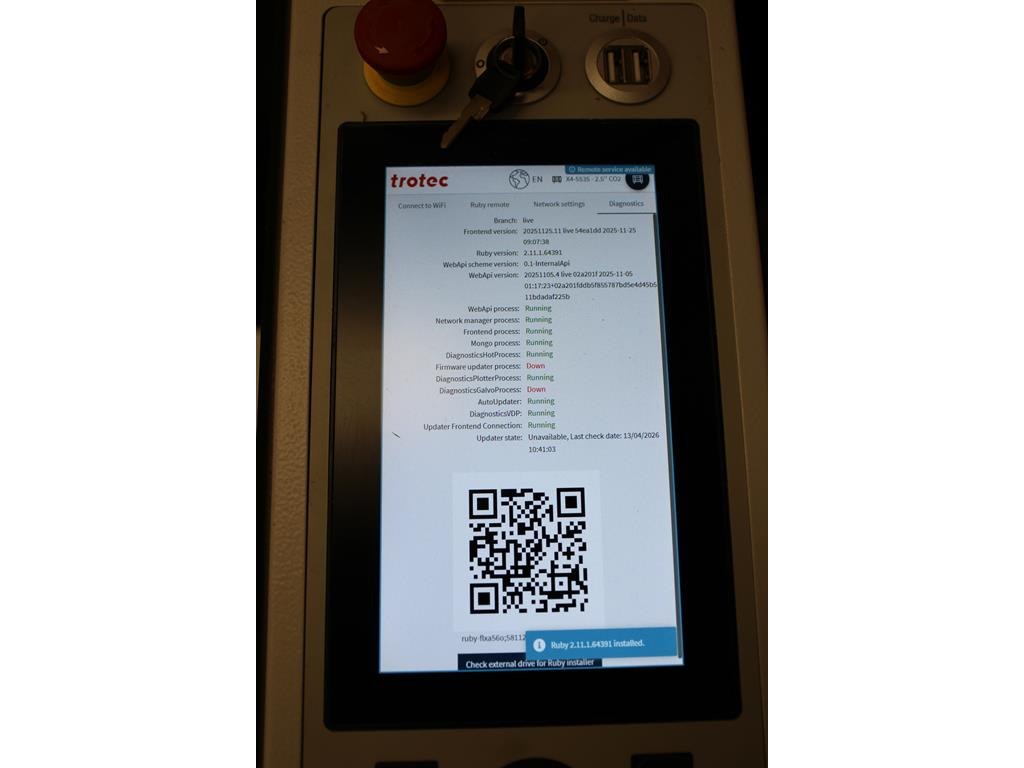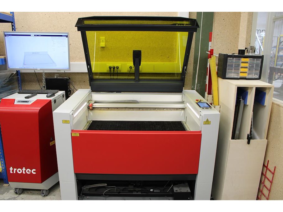Laser-snijmachine TROTEC Speedy 400 Flexx 120/20W AC met TROTEC Atmos Duo Plus F9 230 compressor met 2x 320 m3/h. Twee bedden en twee koppen 120W ceramicore CO2 laser en 20W Fiberlaser. Bouwjaar 8-2022. Met pc DELL, toetsenbord en muis en beeldscherm PHILIPS.