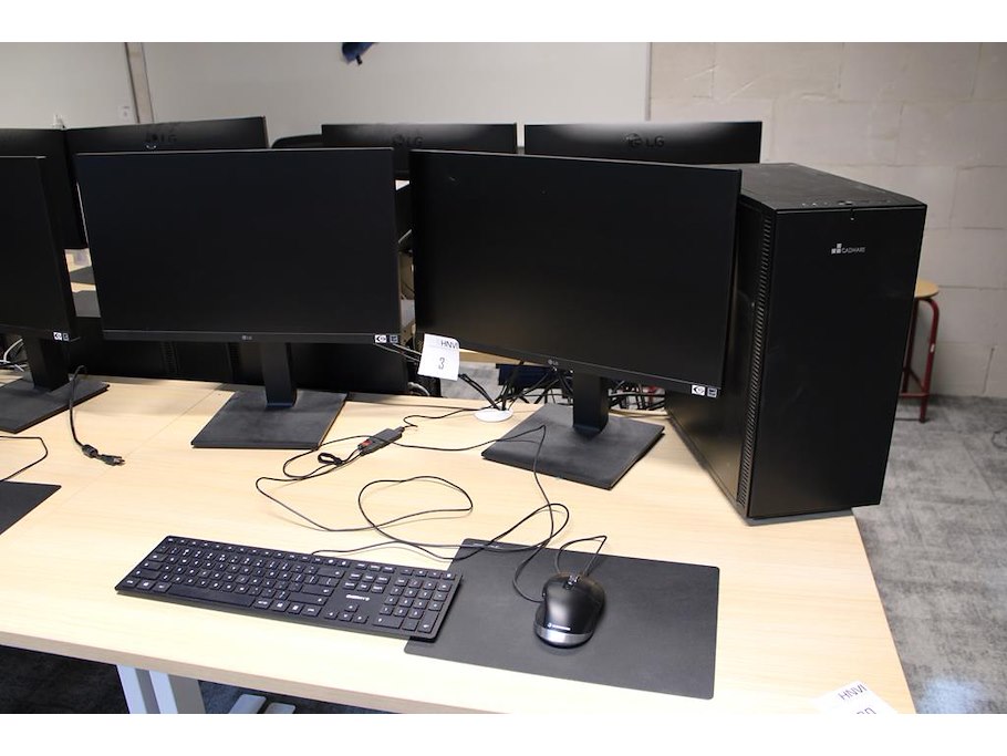 Werkstation CADWARE M13 Mirage5 met Intel Core i7 13700KF processor, 32 GB DDR5-6000 intern geheugen, 5-6GB grafische kaart NVIDIA RTXA2000, 1 TB harde schijf, twee 24 inch monitoren LG 24BP450Y-B, toetsenbord en muis.