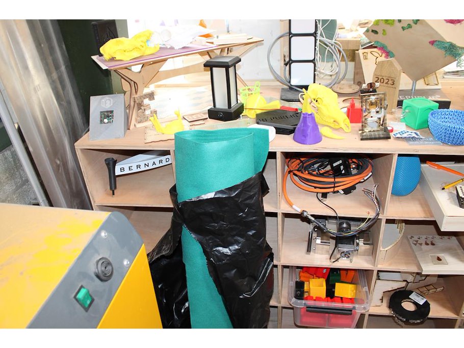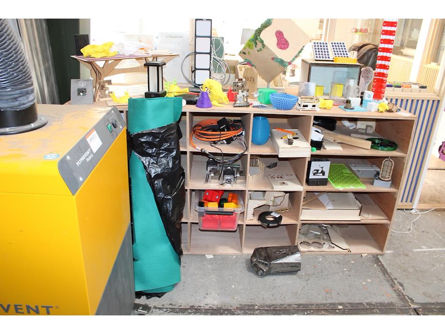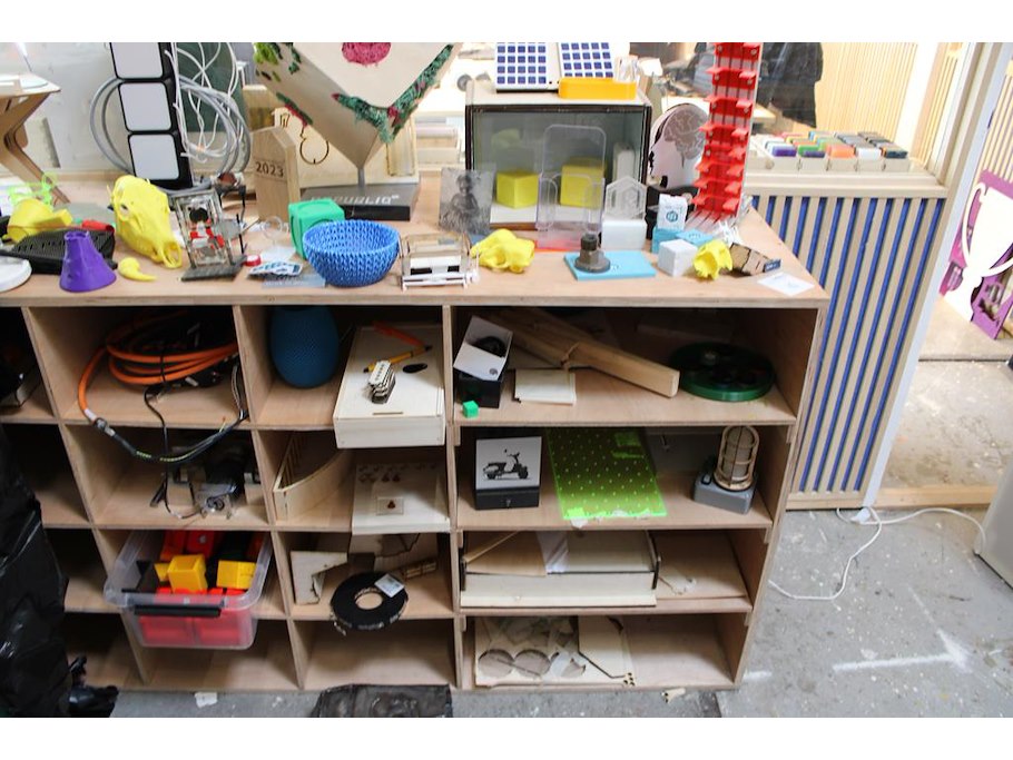 Houten vakkenkast met grote hoeveel projectstukken. Afmeting 200 x 60 x 95 cm.