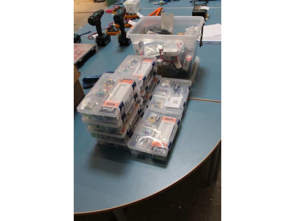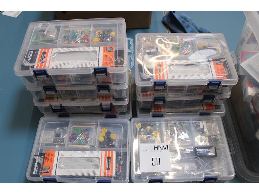 Negen organisers met doe-het-zelf elektropakketten en kunststof krat met servo's, breadboard, weerstanden, adapters, etc.