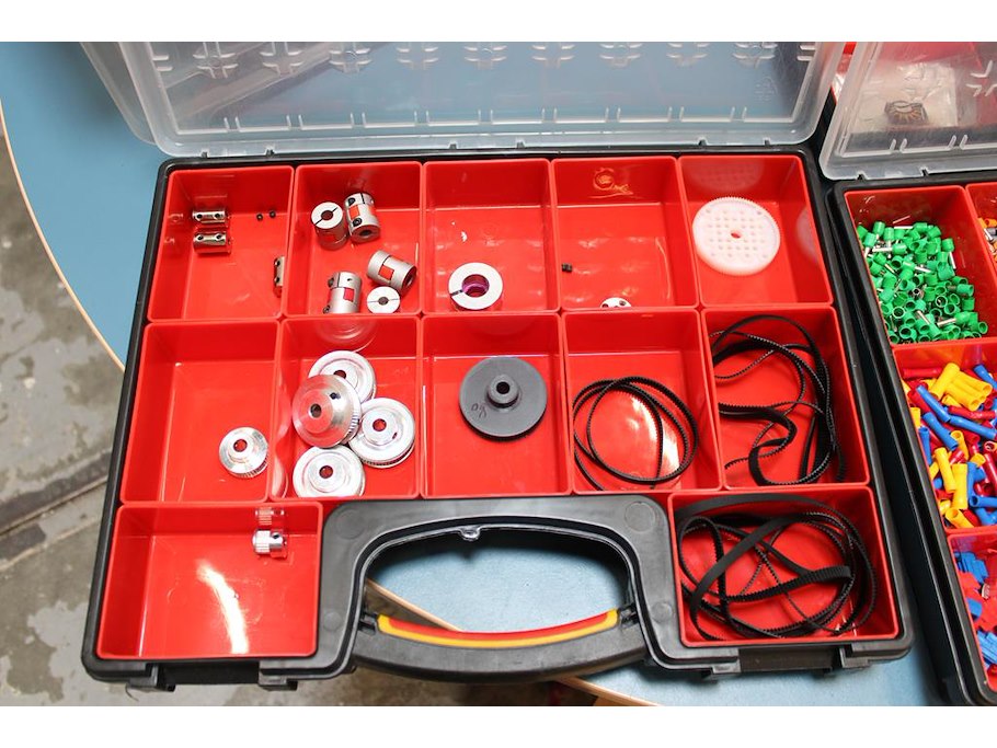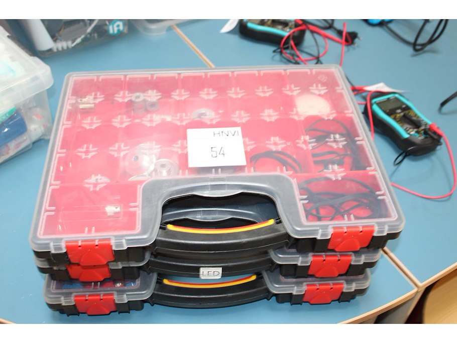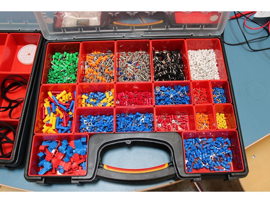Drie organisers met o.a. weerstanden, ledlampjes, adereindhulsjes, tandwielen en kabelschoenen.