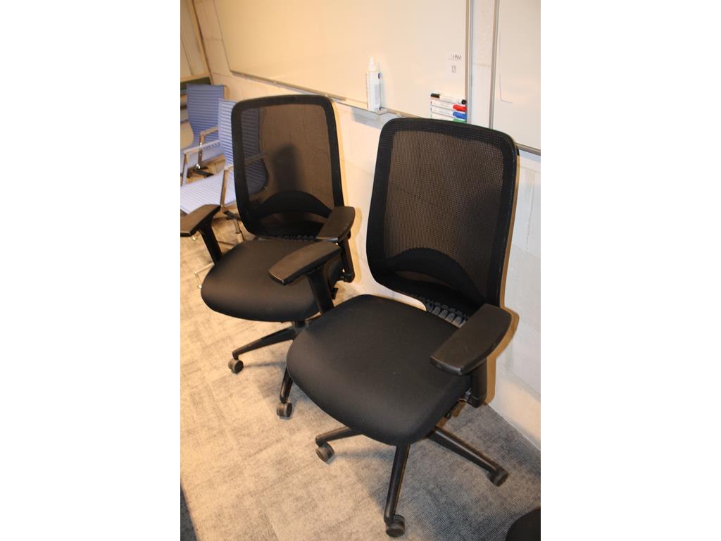 Vier verrijdbare bureau stoelen, zwart gestoffeerd.