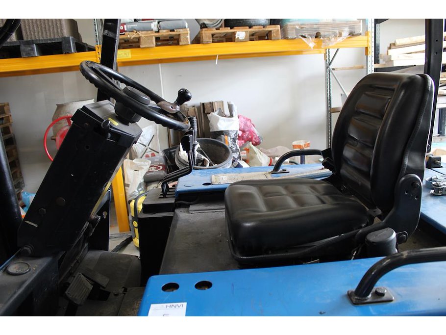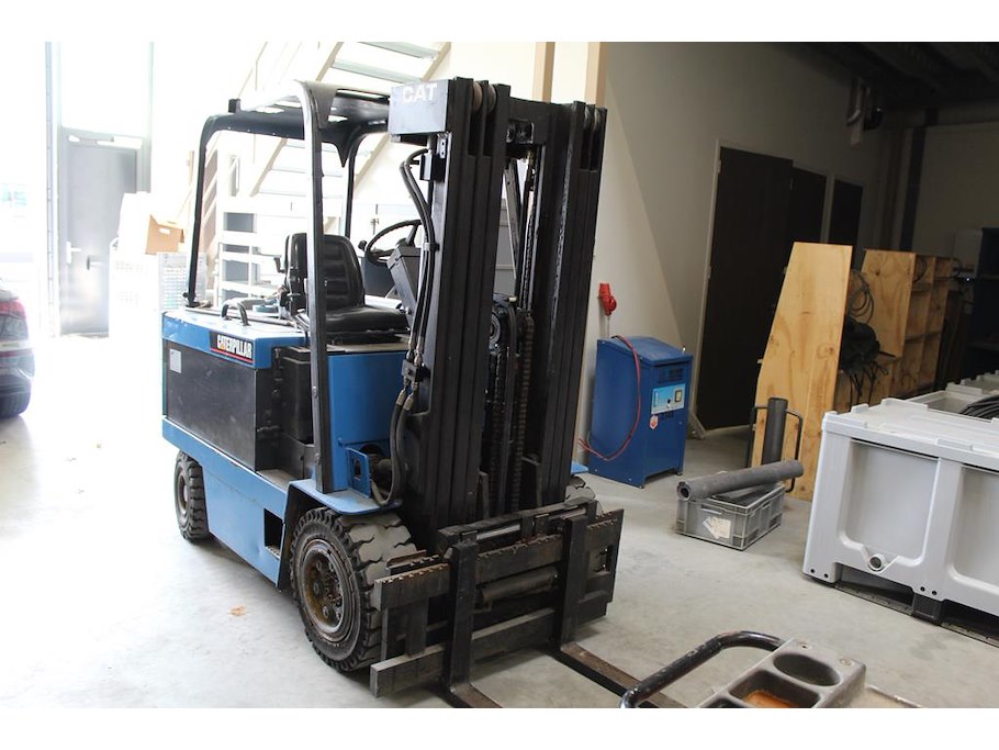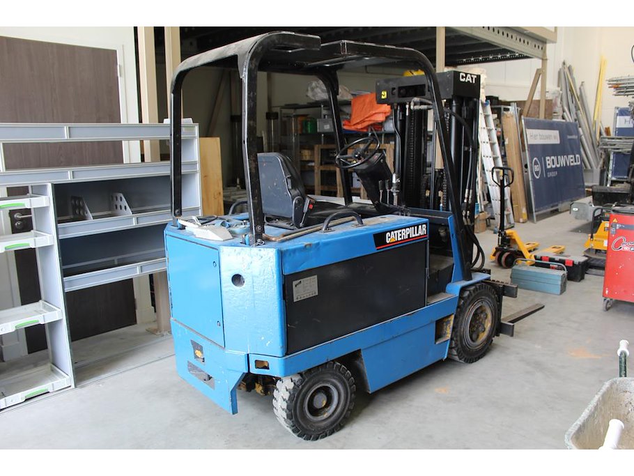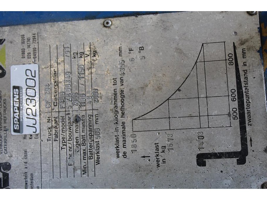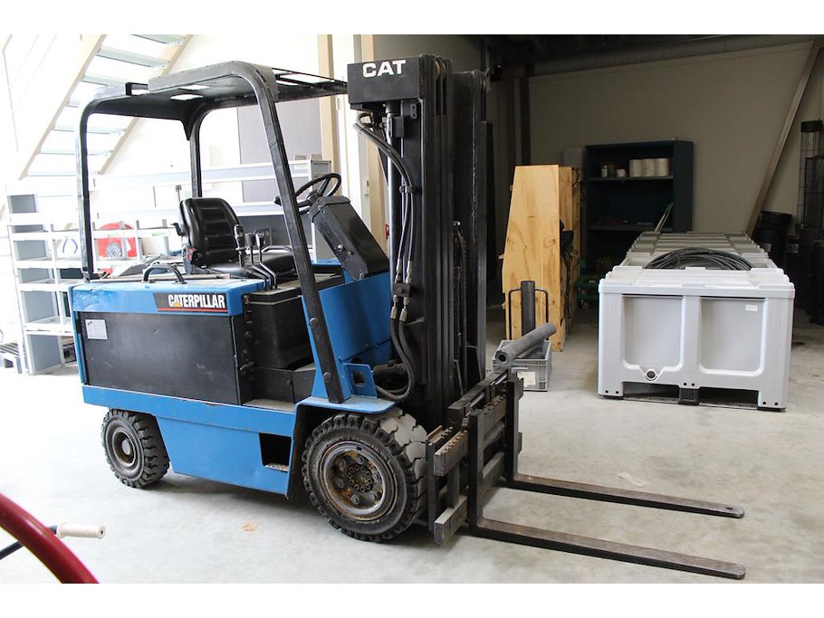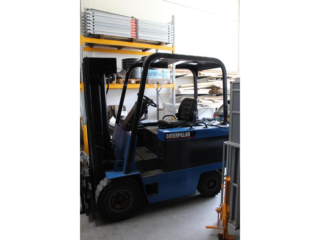 Heftruck CATERPILLER F40D. Bouwjaar 1991. Max. Draaglast 2000 kg. Tellerstanden 22.746 en 776 (twee tellers aanwezig). Max hefhoogte 4355 mm. Linkerlepel bevat kogeloog. Bouwjaar accu 2010. Let op! Ophalen aan het einde van de afhaaldag.