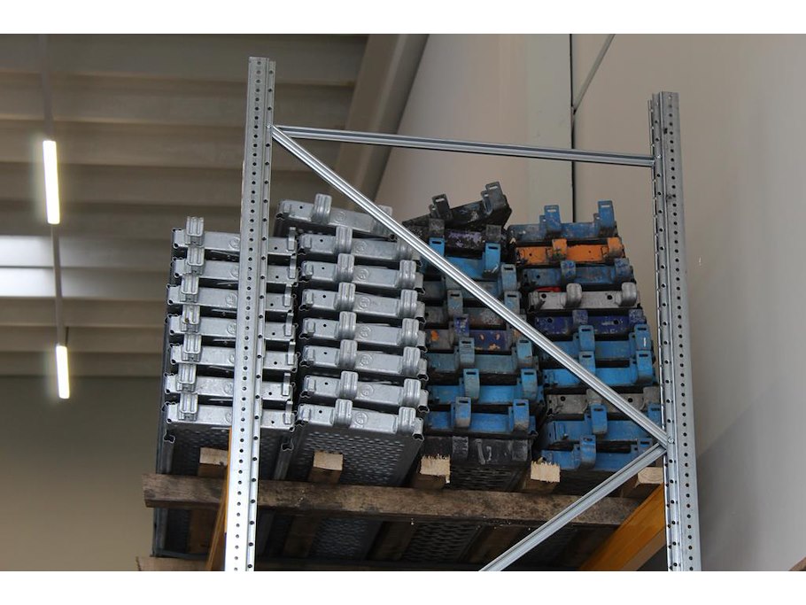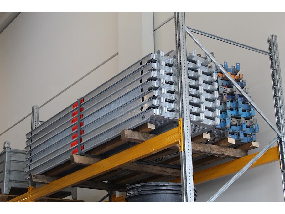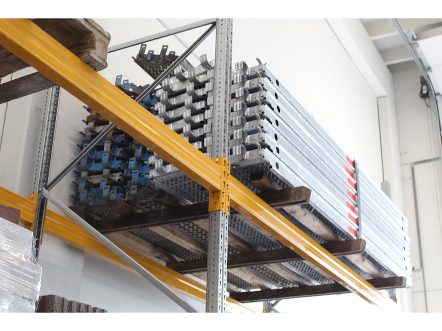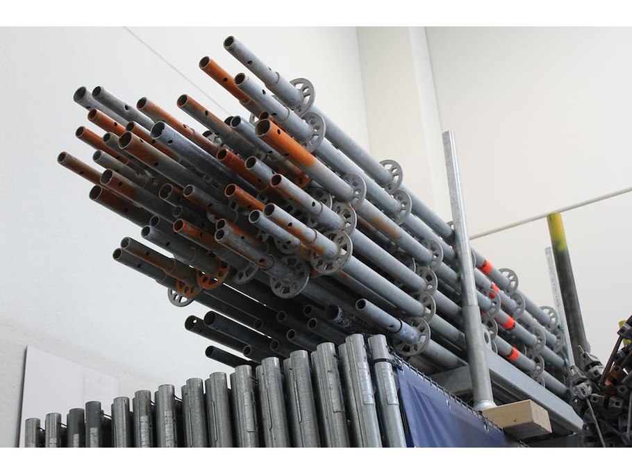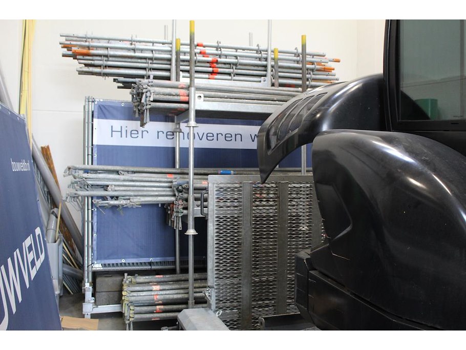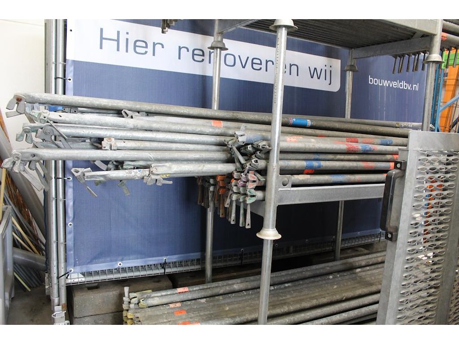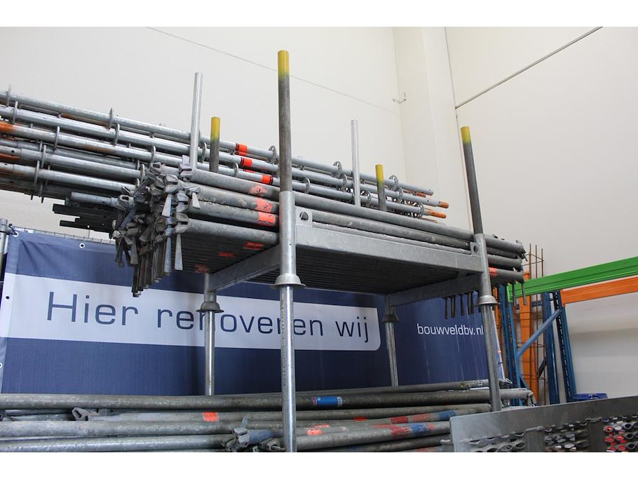 Steigermaterialen in de stellingen en in stapelbokken w.o. loopplanken en buismateriaal. Bestaande uit ca. 50 staanders met lengte ca. 300 cm, 50 stangen met lengte 250 cm, ca. 30 stangen met lengte 200 cm, ruim 30 stangen met lengte 130 cm, ca. 25 diagonalen en 35 legborden met 17 stuks lengte ca. 250 cm en 20 stuks ca. 200 cm