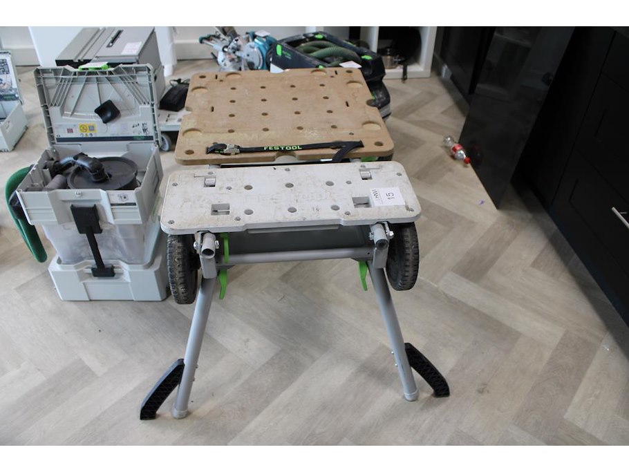 Inklapbare werktafel festool ug-csc-sys met steekwagenfunctie. let op ! onderdeel van combinatiekavel b017 onderdeel van combinatiekavel combinatiekavel festool gereedschappen kavels b013 t/m b016. zaag-en werktafel met afzuiging.