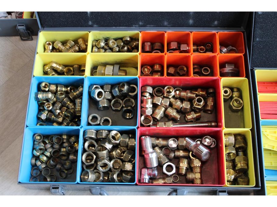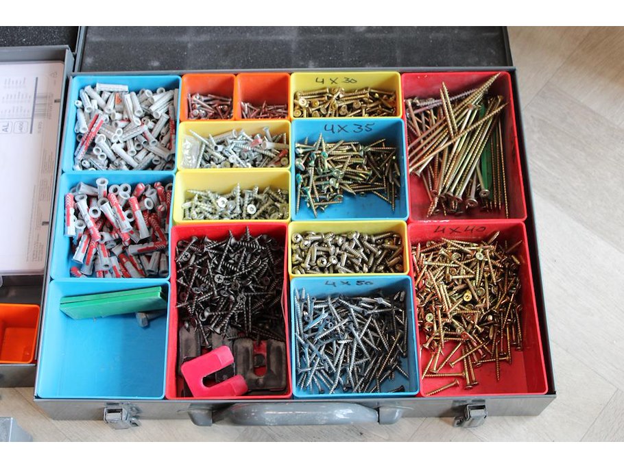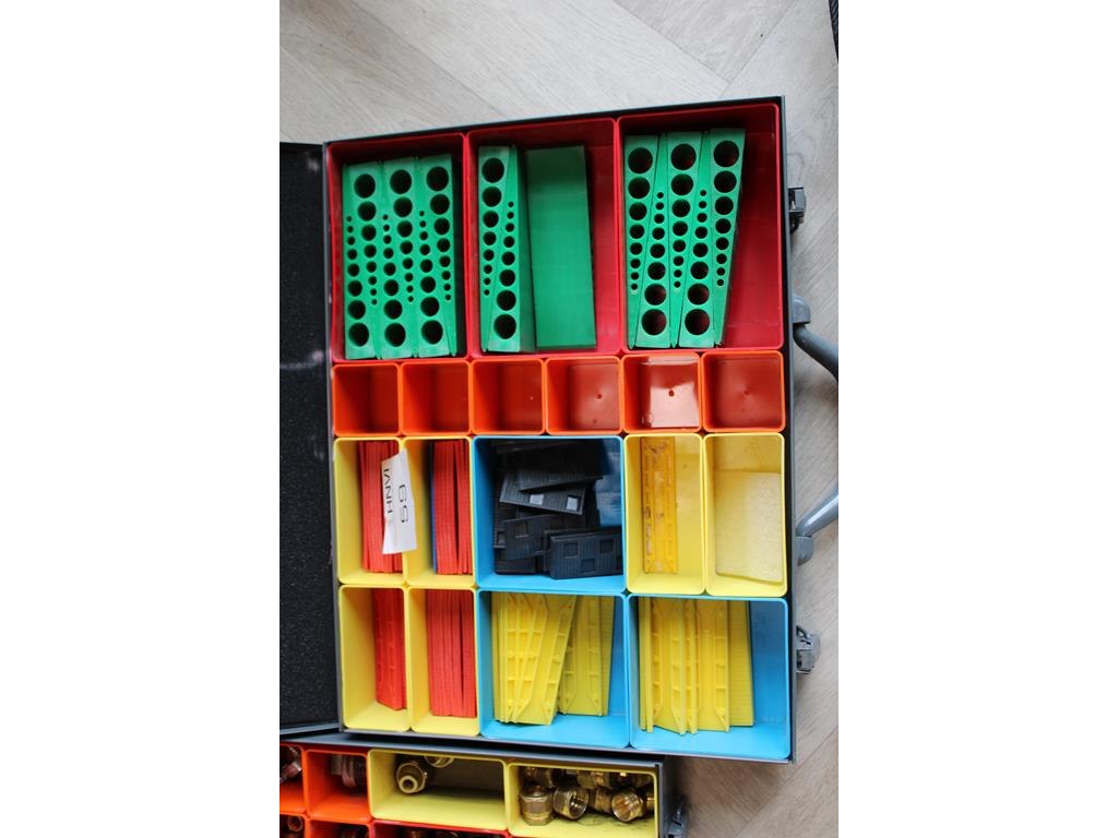 Vijf organizers met diverse bouw gerelateerde producten w.o. bevestigingsmaterialen, wiggen en koppelingen.