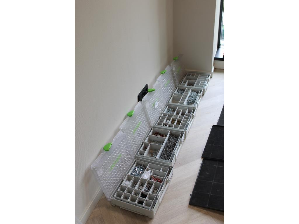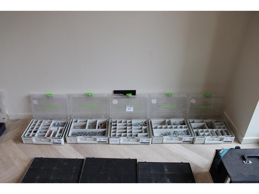 Vijf koppelbare organizers FESTOOL gevuld met diverse bevestigingsmaterialen.