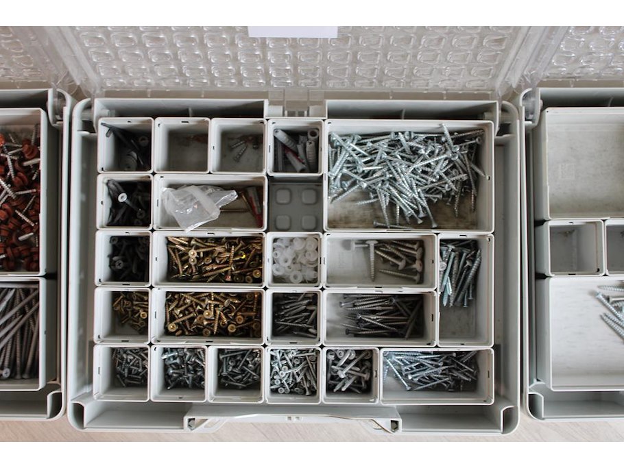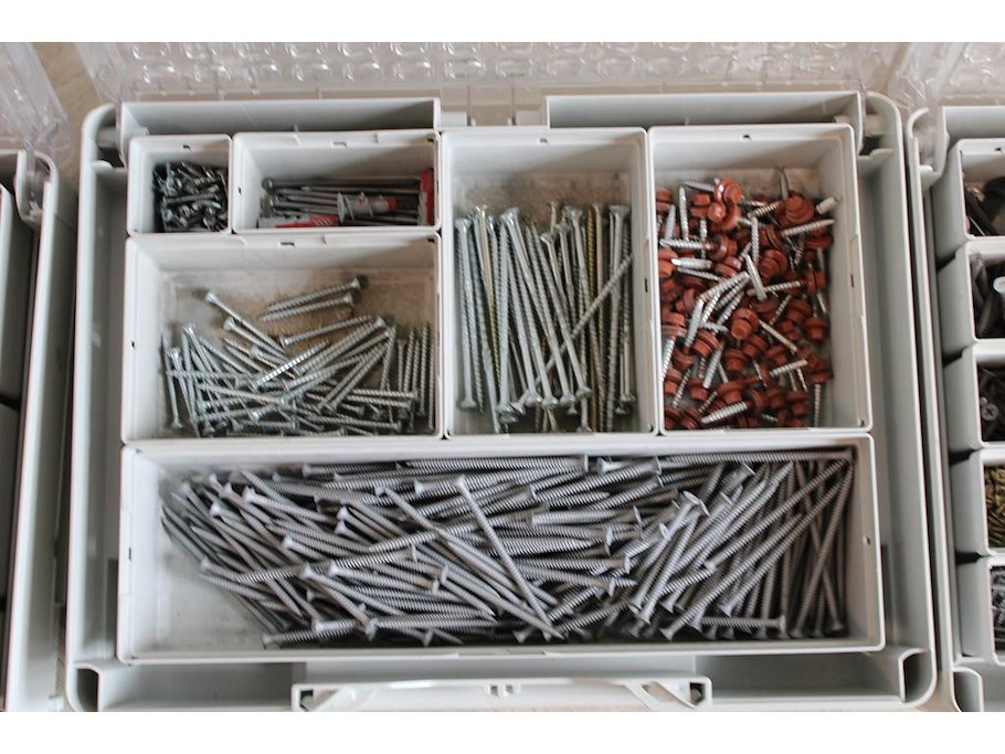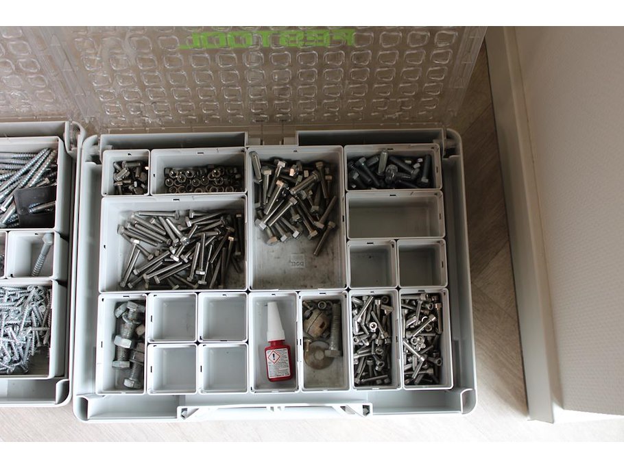 Vijf koppelbare organizers festool gevuld met diverse bevestigingsmaterialen.
