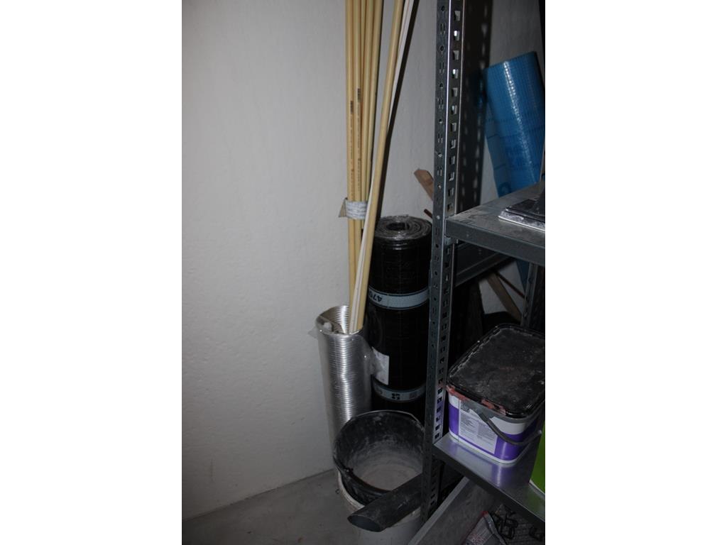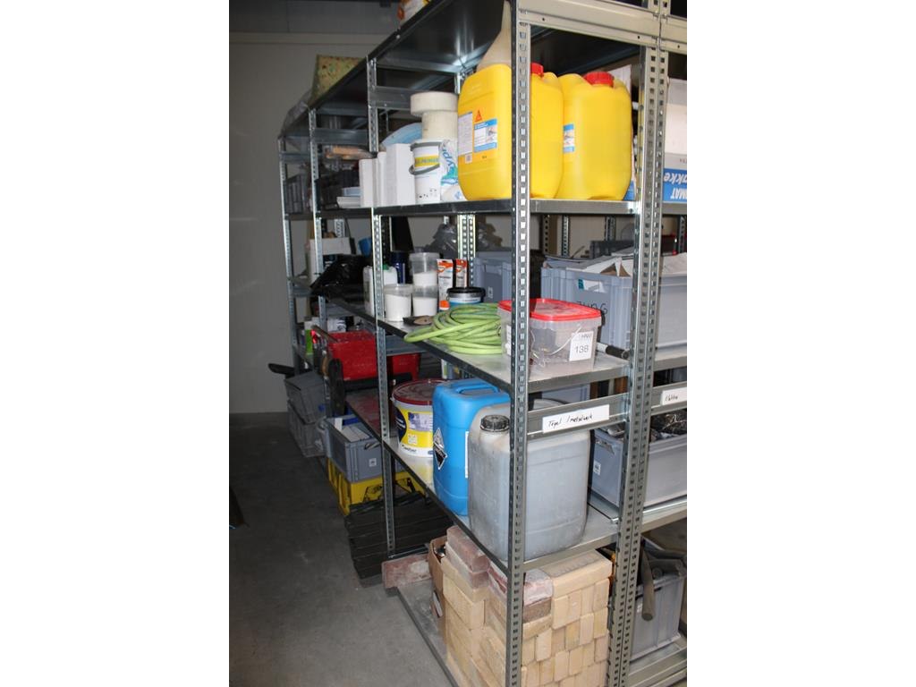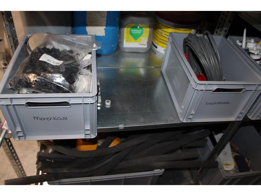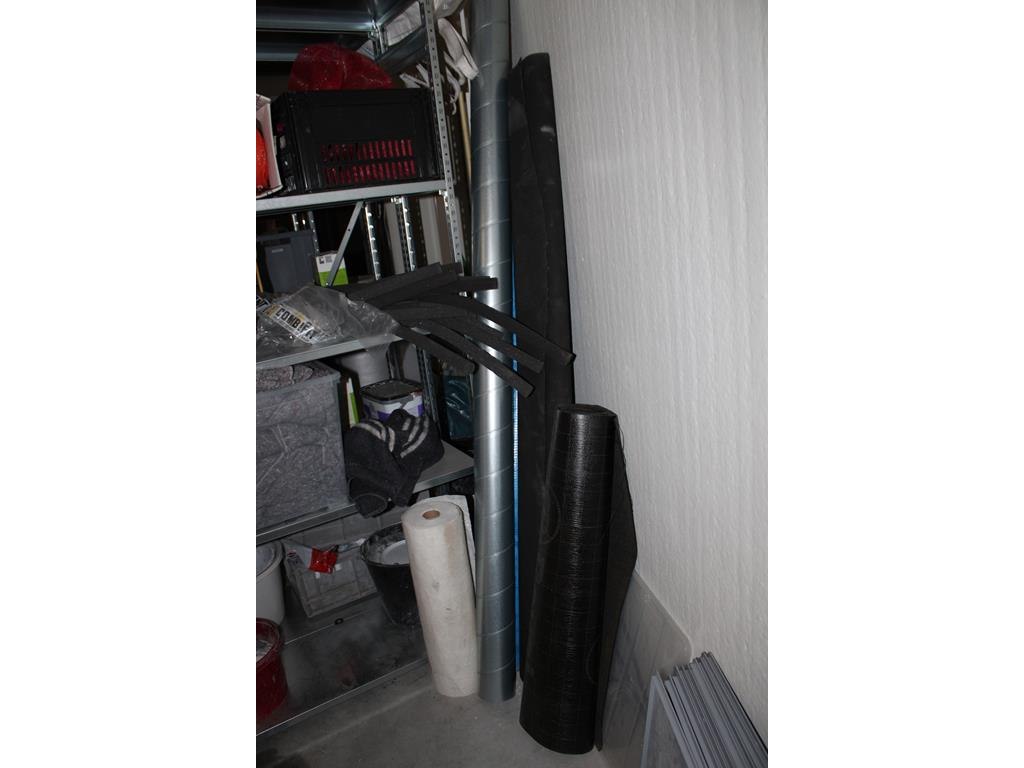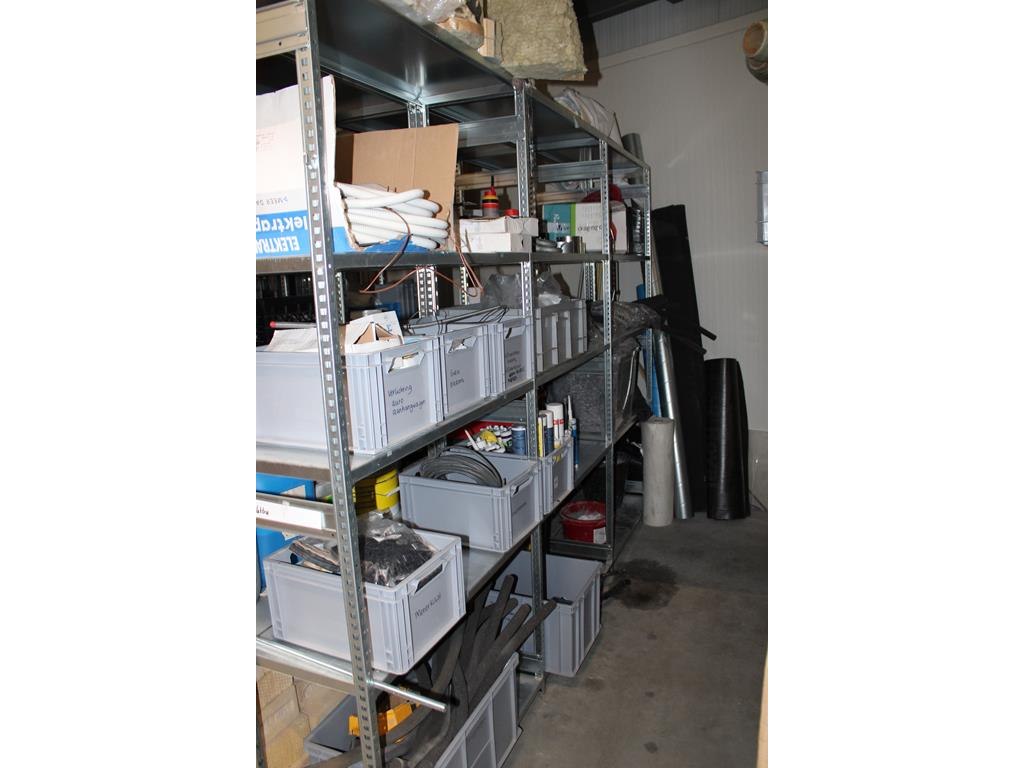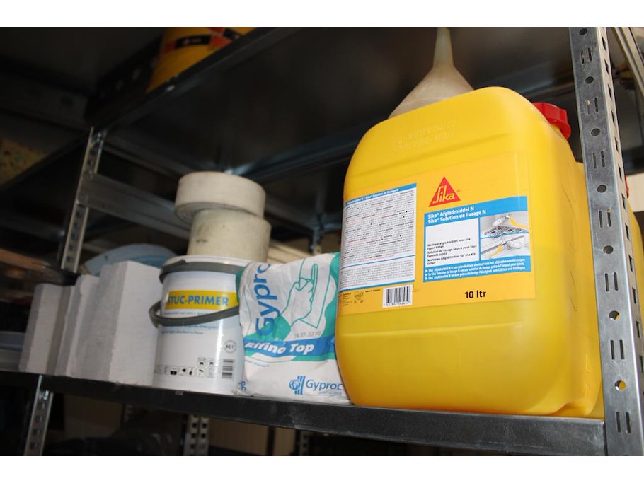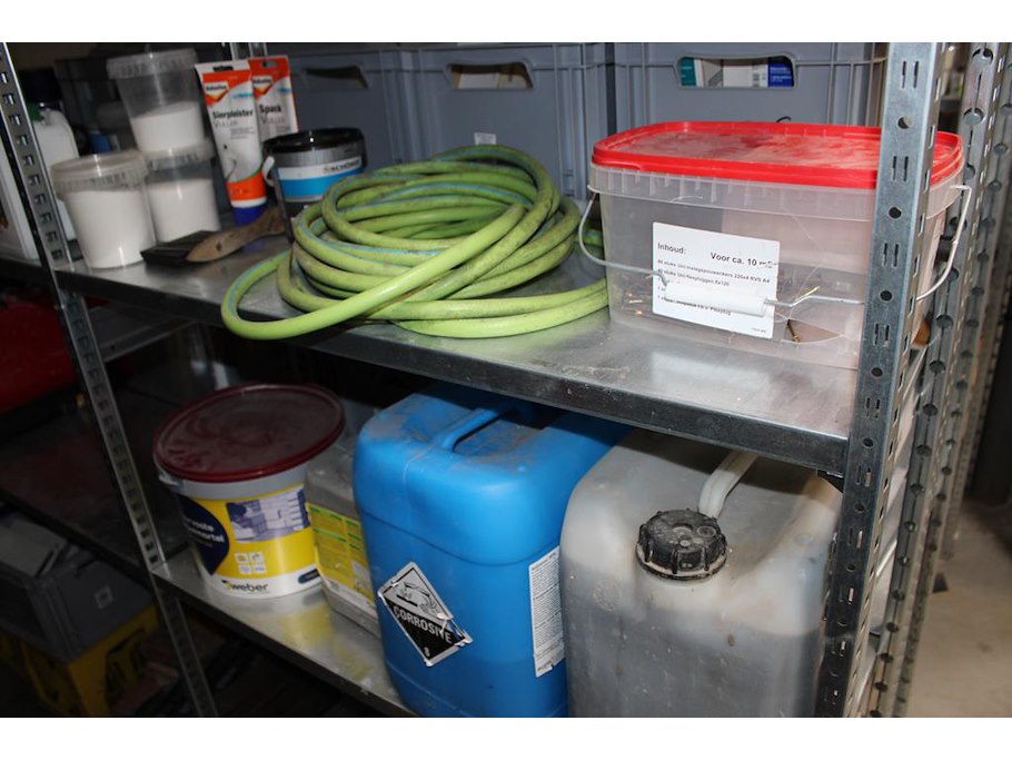 Inhoud zesdelige stelling w.o. elektra, kitten, verhuisdekens, isolatie, mortels enz. in en achter stelling.