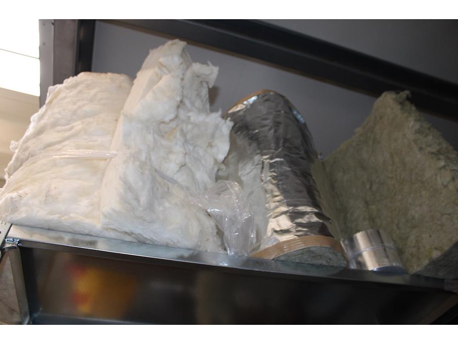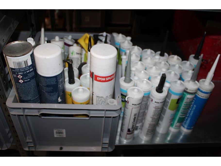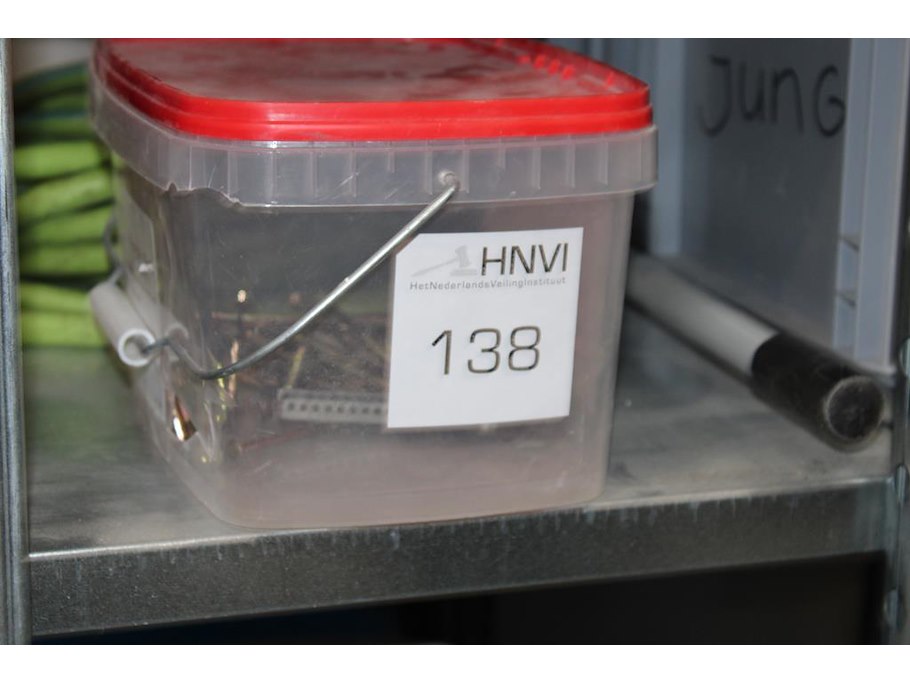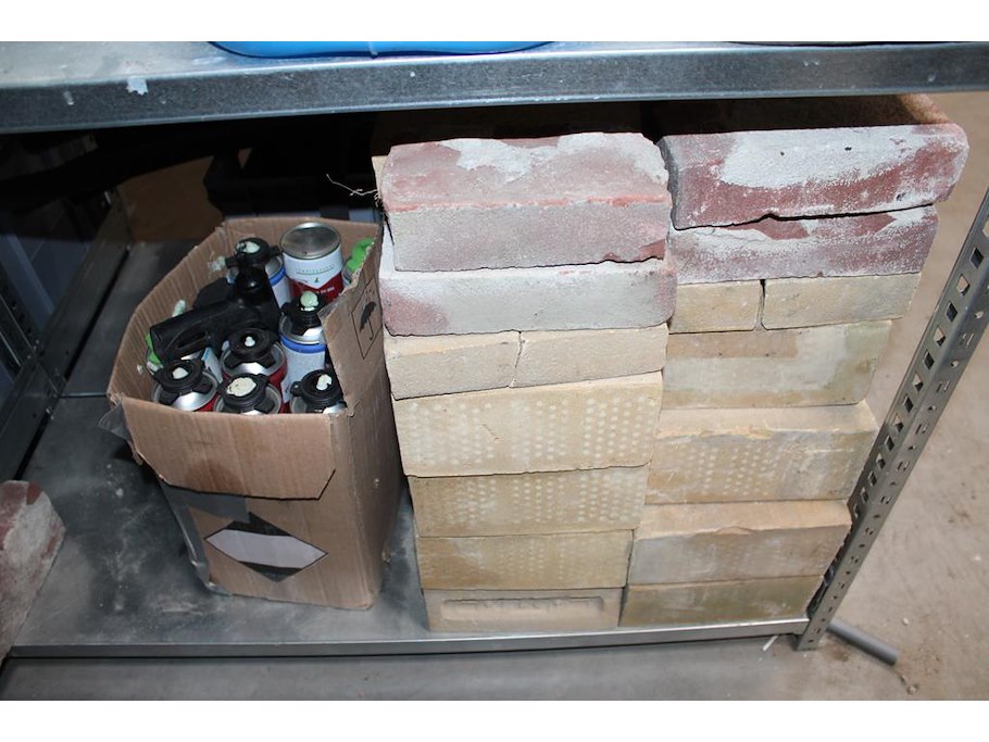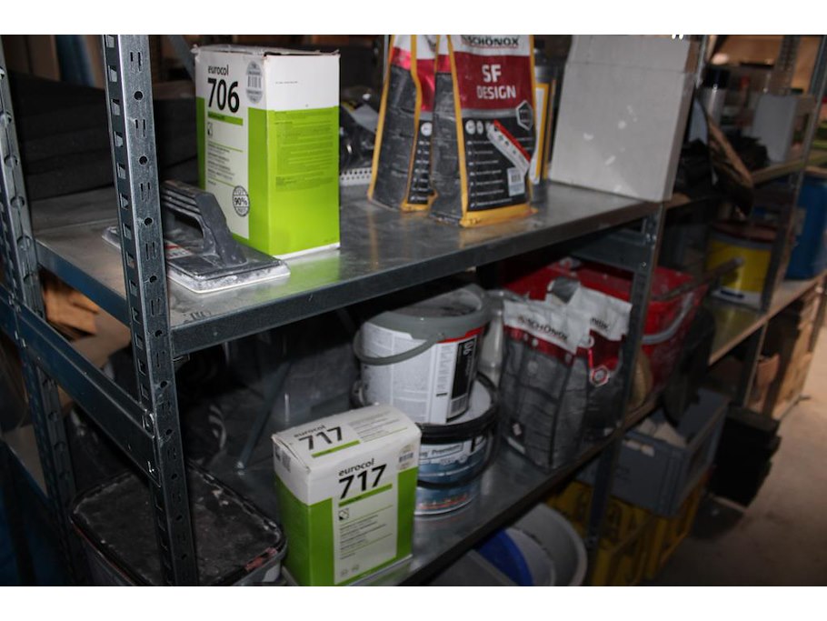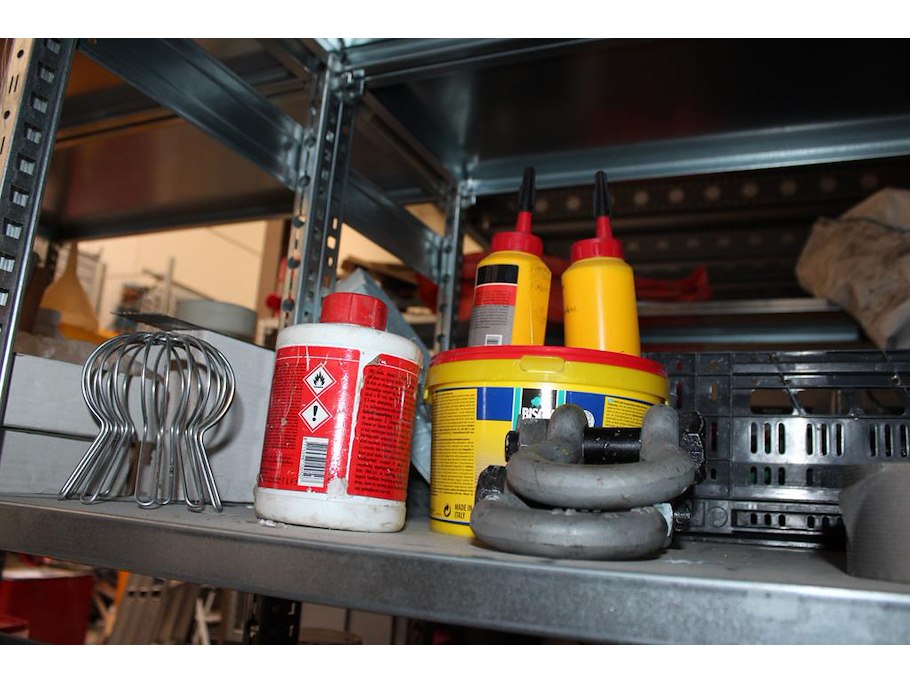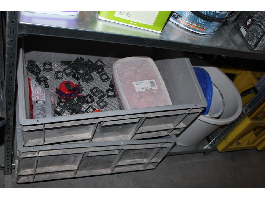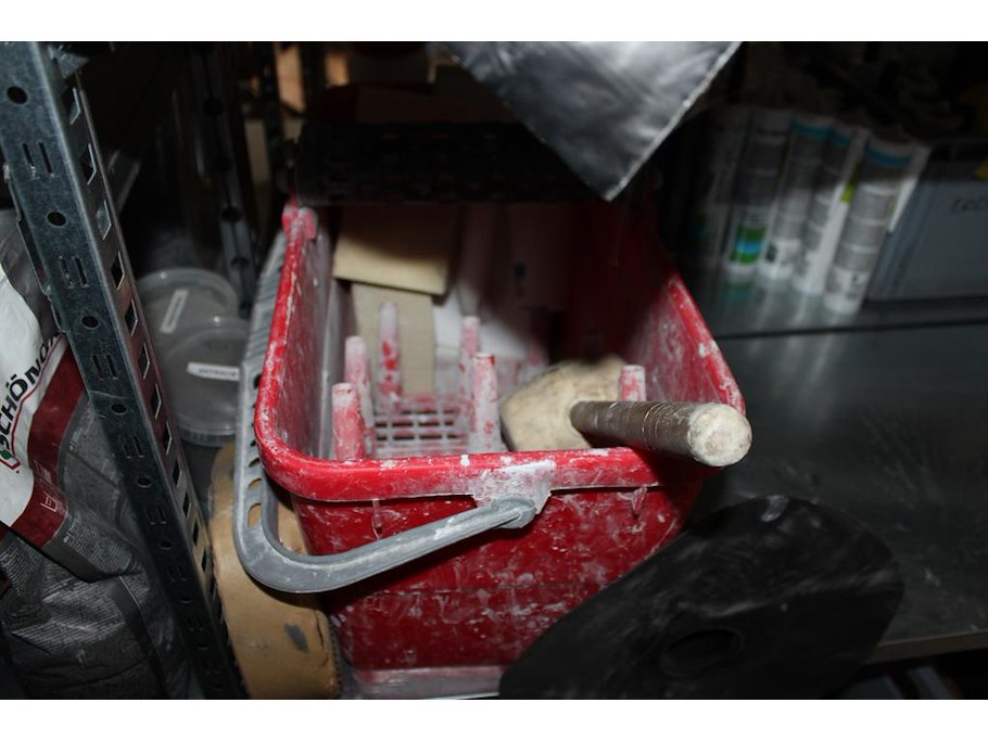 Inhoud zesdelige stelling w.o. elektra, kitten, verhuisdekens, isolatie, mortels enz. in en achter stelling.