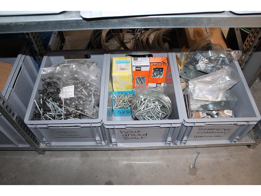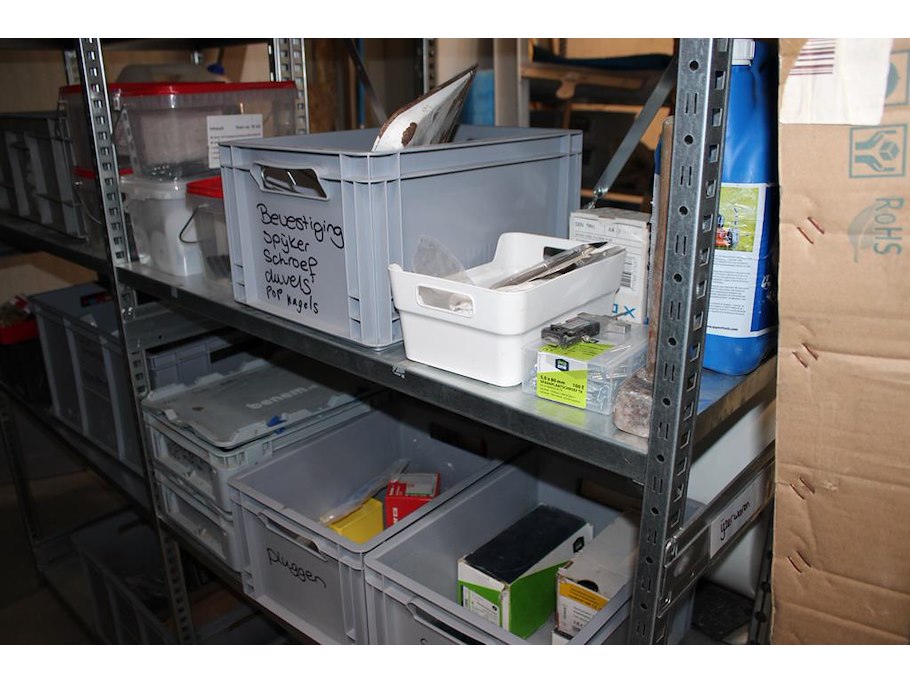 Inhoud vierdelige stelling w.o. bevestigingsmaterialen, werk handschoenen, blikken, isolatiepluggen en glas...
