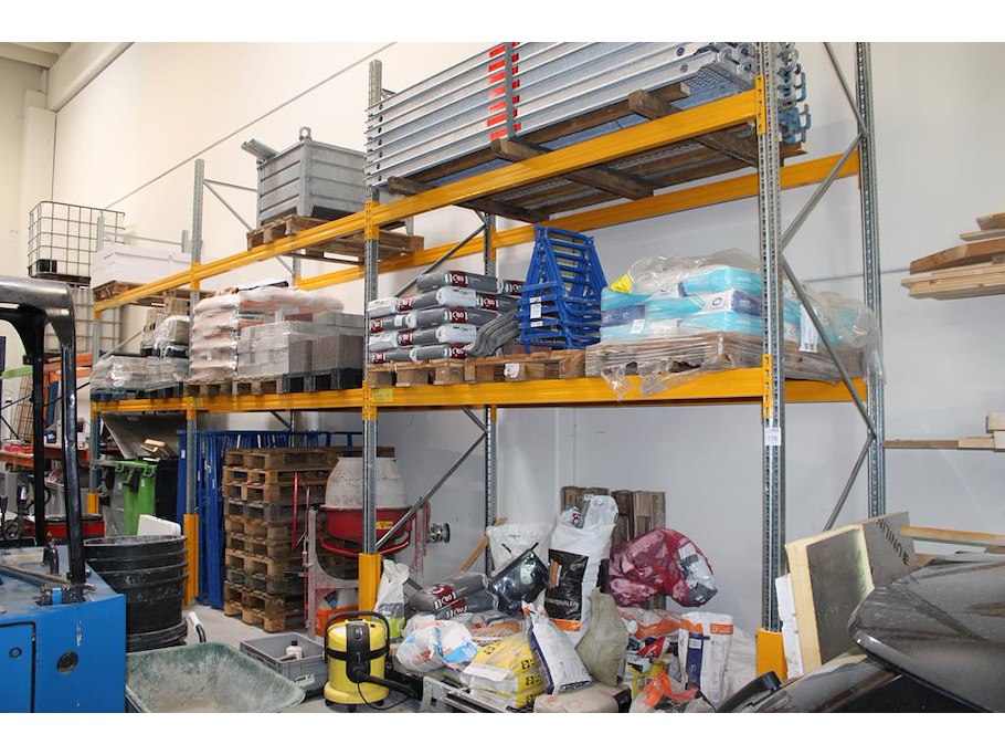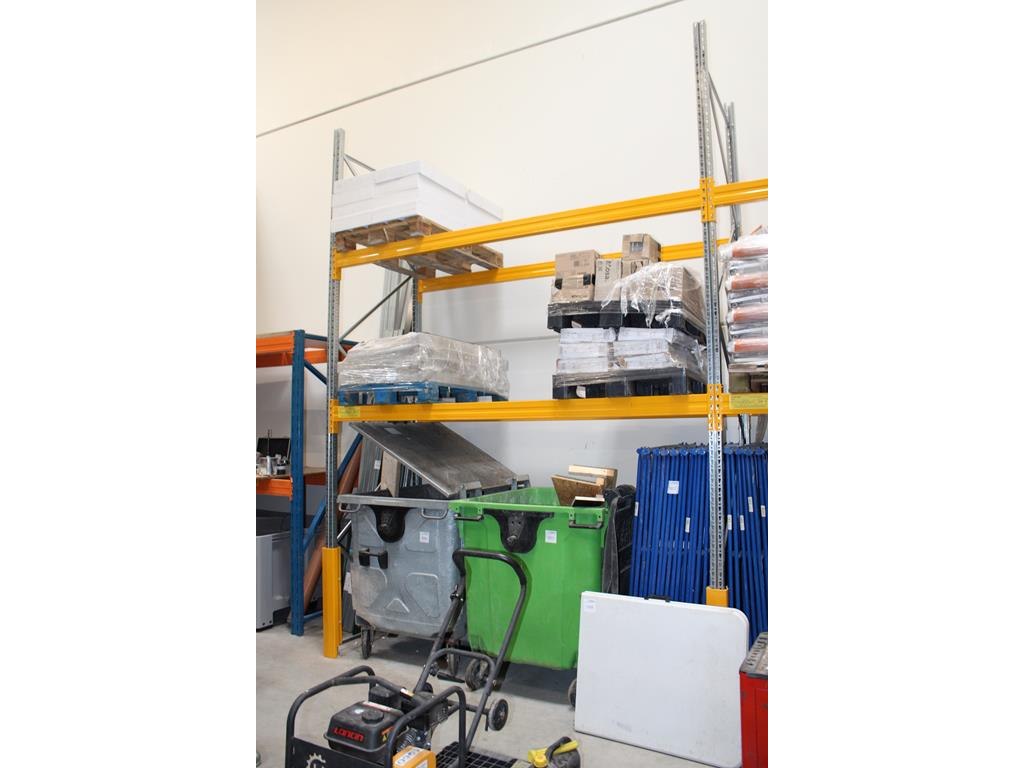Palletstelling met vier staanders. afmeting 110 x circa 400 cm. twaalf leggers met lengte 270 cm. vier bes...