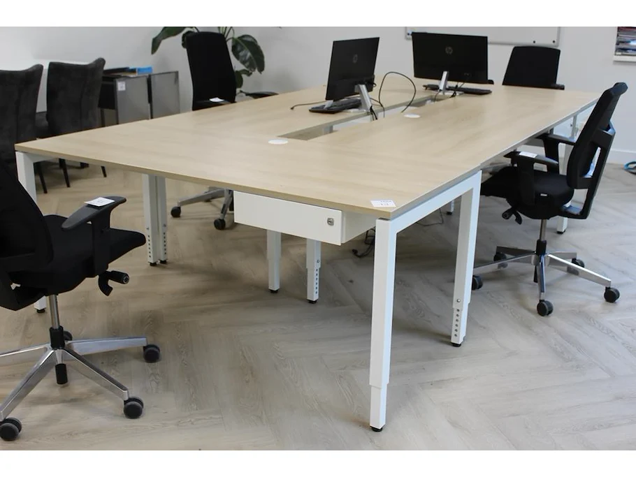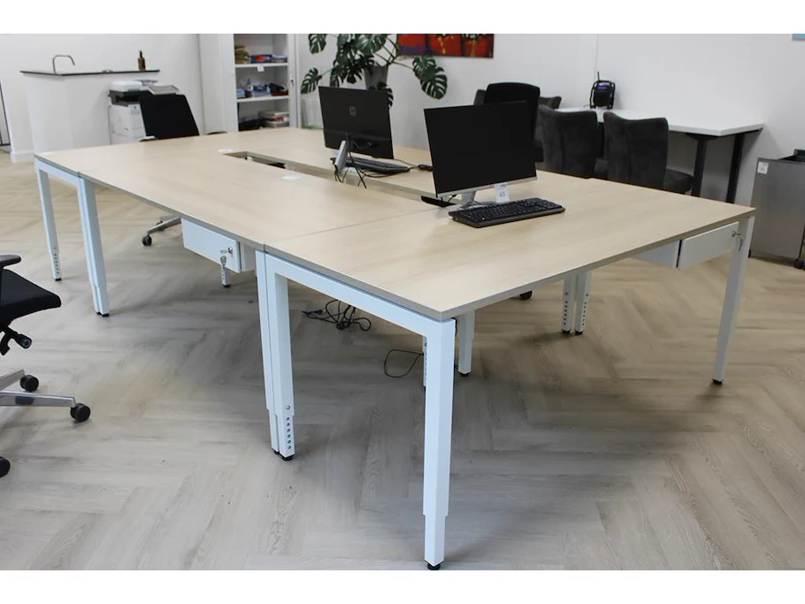 Vier in hoogte verstelbare bureaus met lade en kabeldoorvoer. Bladafmeting 180 x 80 cm.