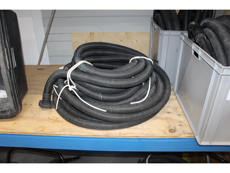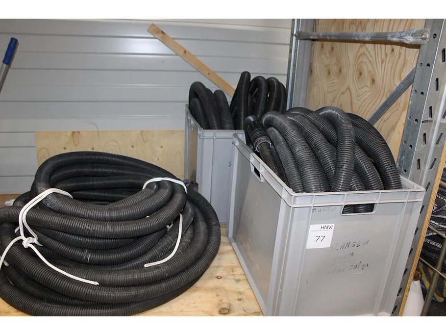 Stofzuigerslangen in 2 kratten en op schap.