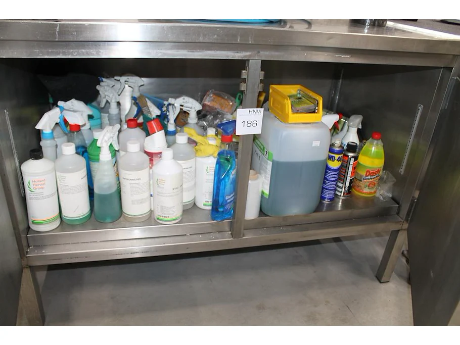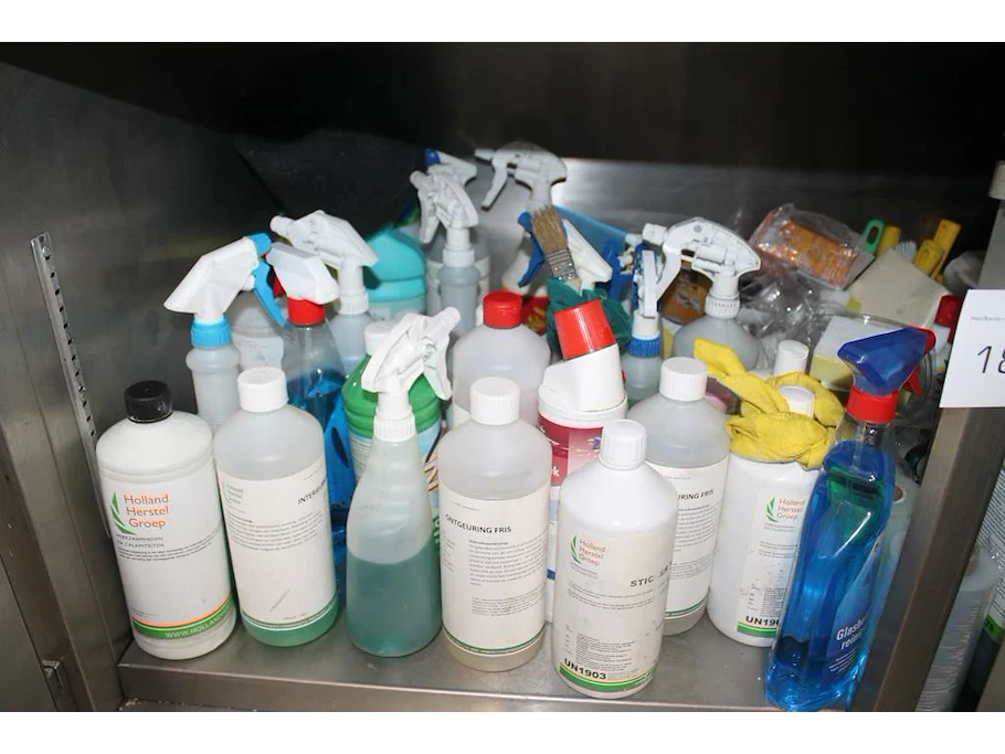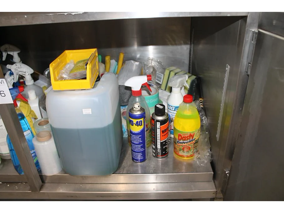 Schoonmaakmiddelen in kast w.o. schuursponzen, verfrissers en reinigers.