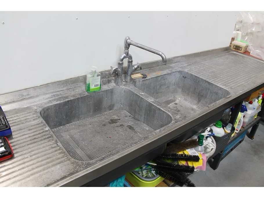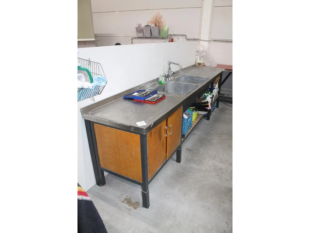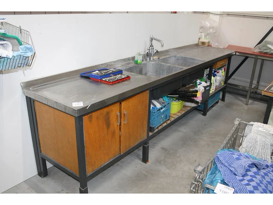 Spoelmeubel met mengkraan, lade en onderkast met 2 deuren. Afmeting 340 x 70 x 90 cm. Let op: exclusief achterwand en inhoud.
