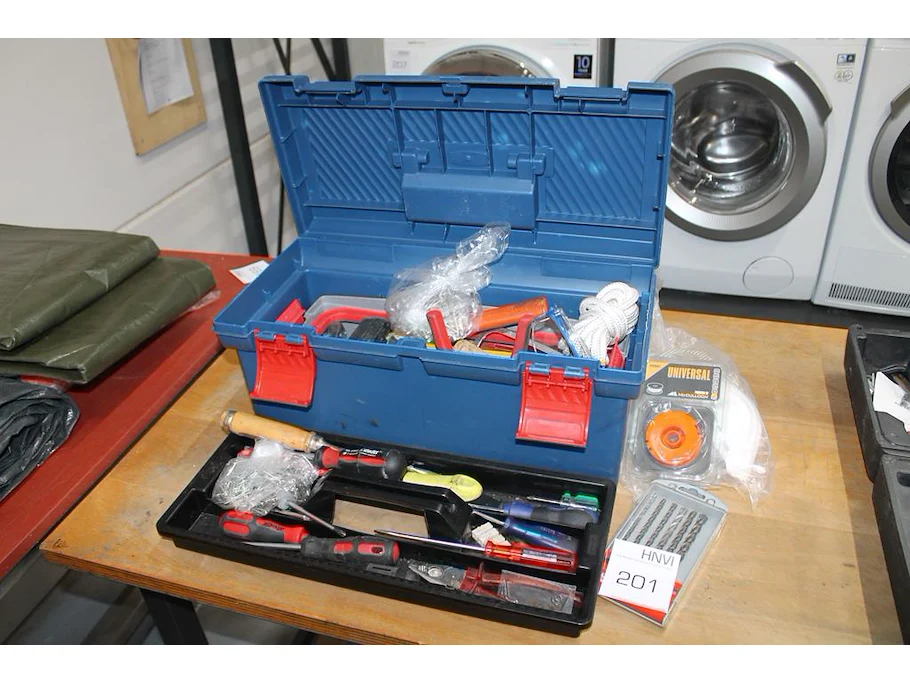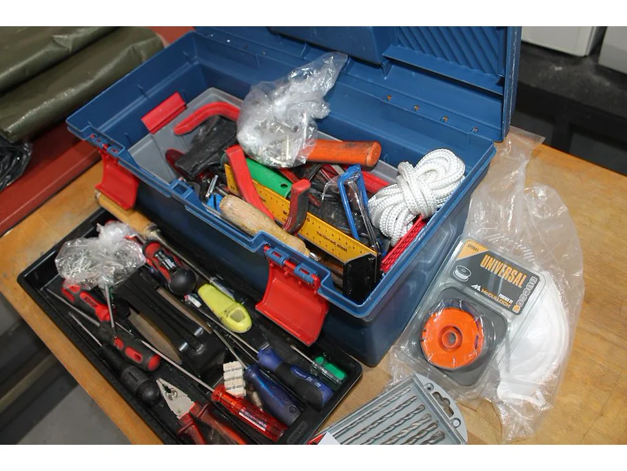 Gereedschappen in kist w.o. sleutels, schroevendraaiers, tangen en hamer.