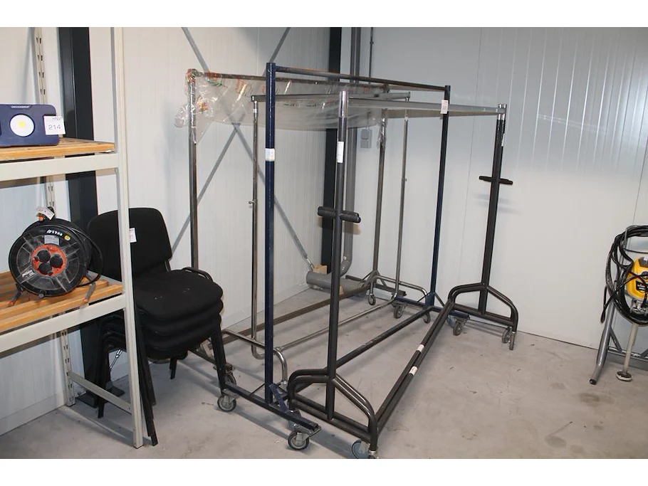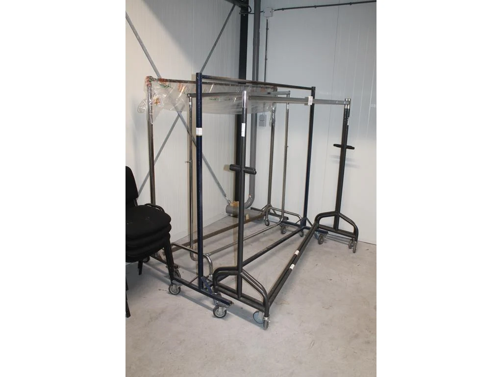 Vijf diverse kledingrekken.