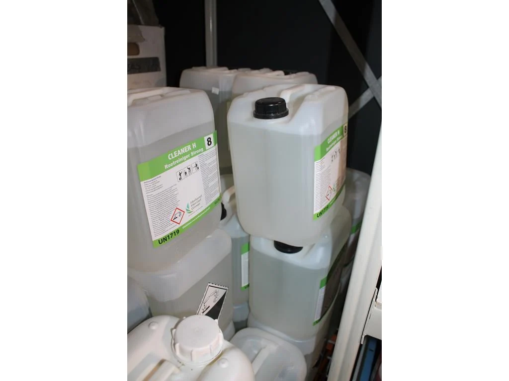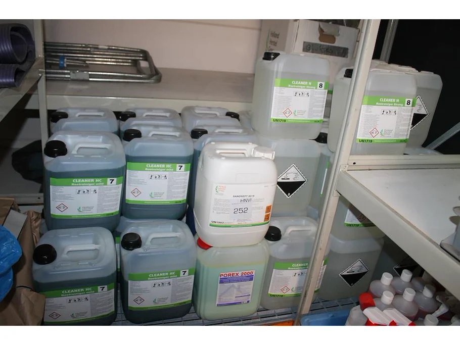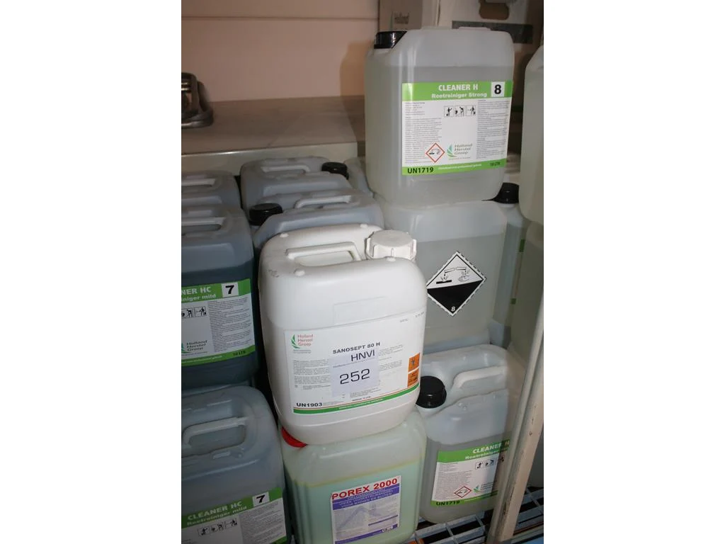 Ruim 30 cans reinigingsmiddelen w.o. roetreiniger mild en strong, sanosept 80 h en porex 2000.