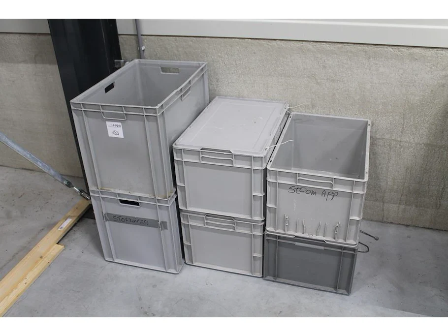 Zes kunststof stapelbakken in diverse maten.