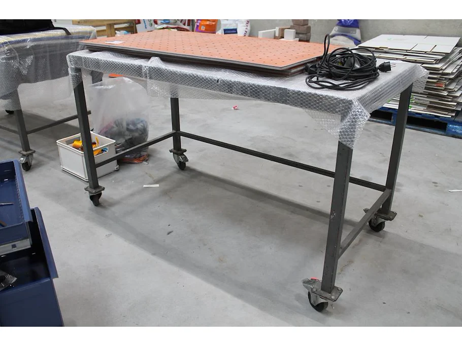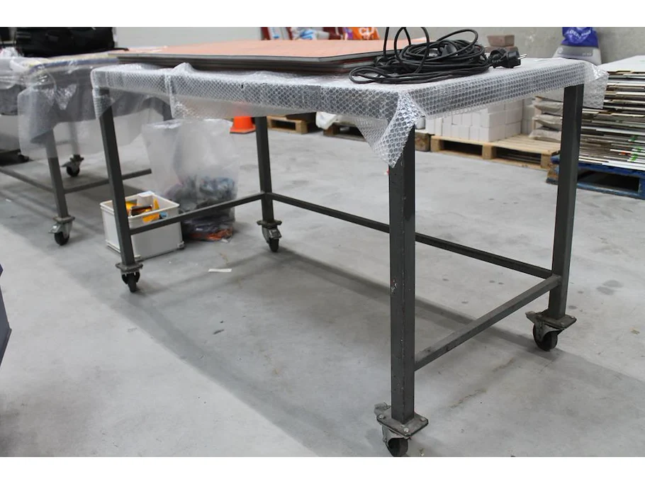 Verrijdbare werktafel met afmeting 150 x 76 x 90 cm.