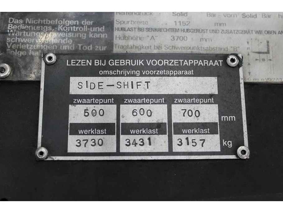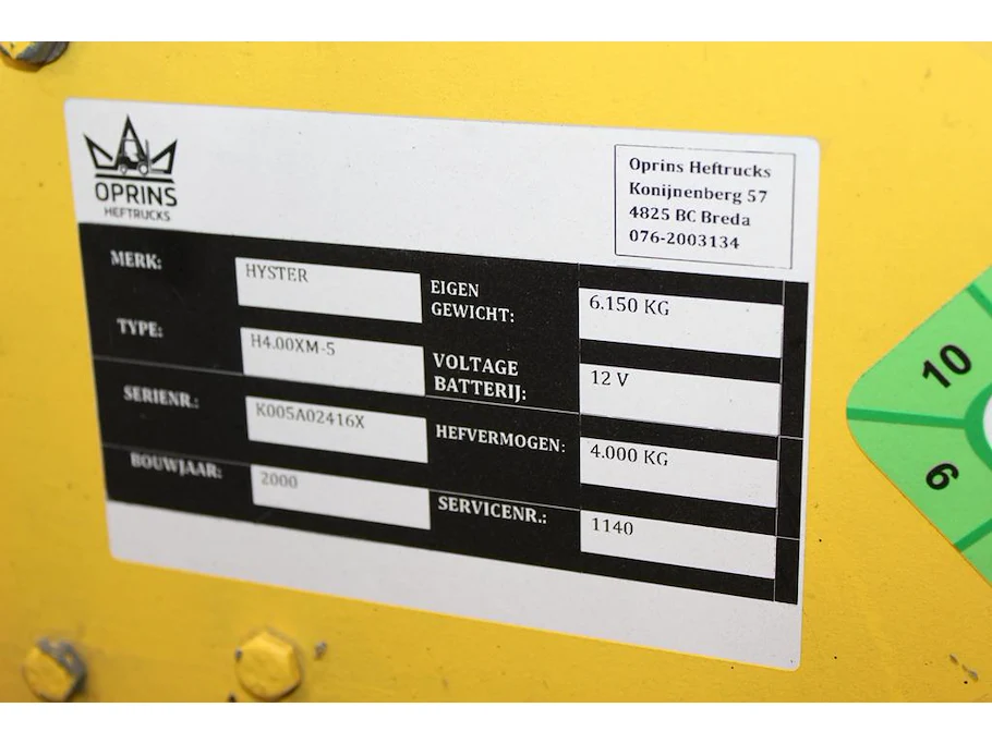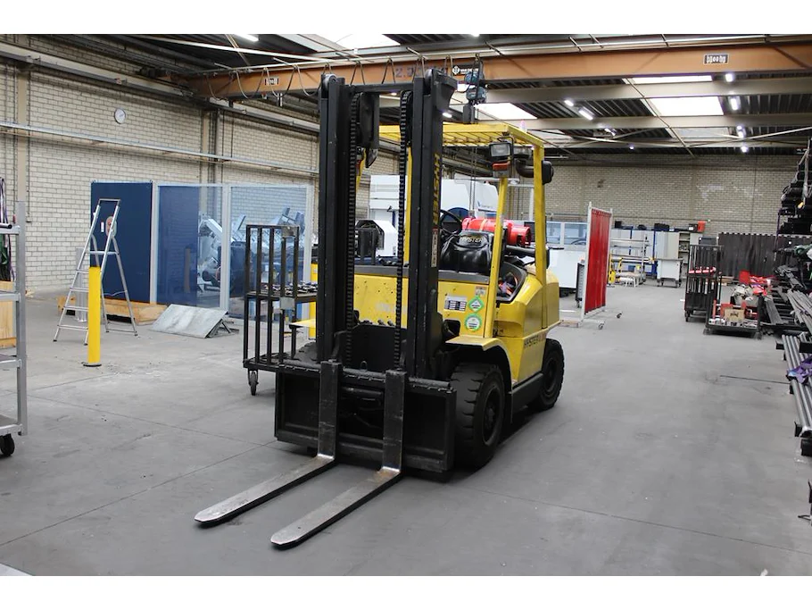 Gasheftruck HYSTER H4.00XM-5 v.v. sideshift, tweedelige mast en afgelezen urenstand 5827 uur. Bouwjaar 2000. Hefvermogen 4 ton. Maximale hefhoogte 370 cm. Eigen gewicht 6128 kg. Let op: ophalen in overleg.